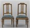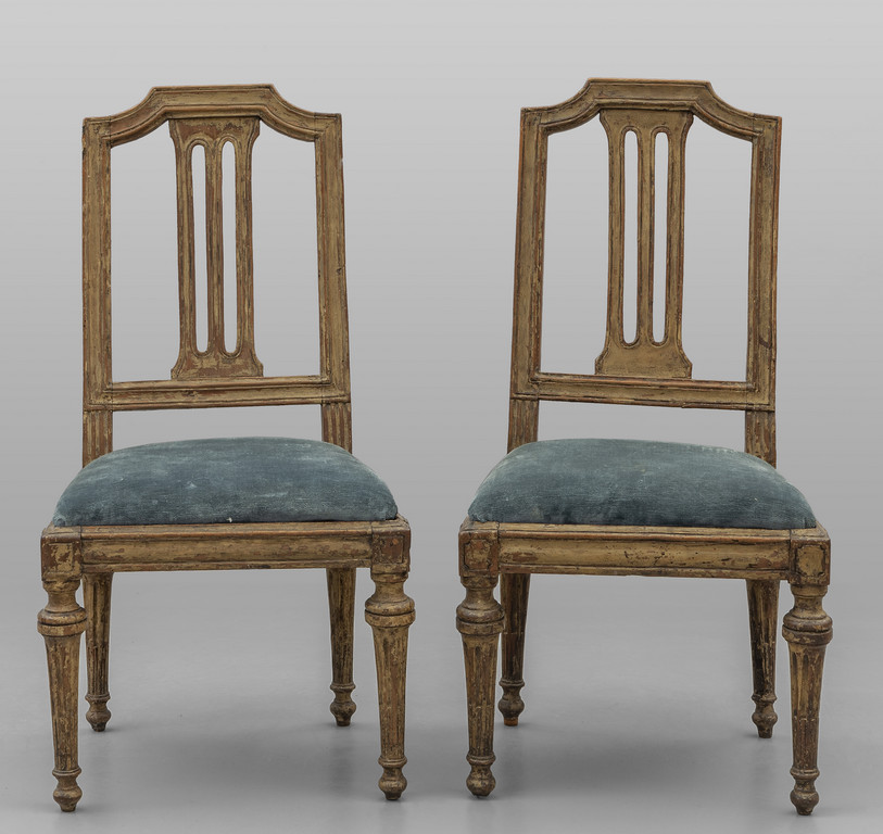 Coppia di sedie Luigi XVI in legno laccato chiaro con seduta in velluto azzurro Piemonte sec.XVIII