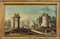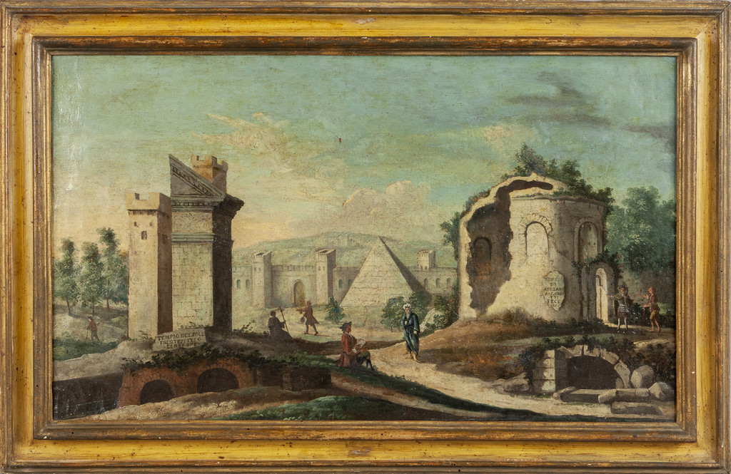 Scuola piemontese sec.XVIII 'Paesaggio animato con templi' olio cornice coeva
