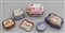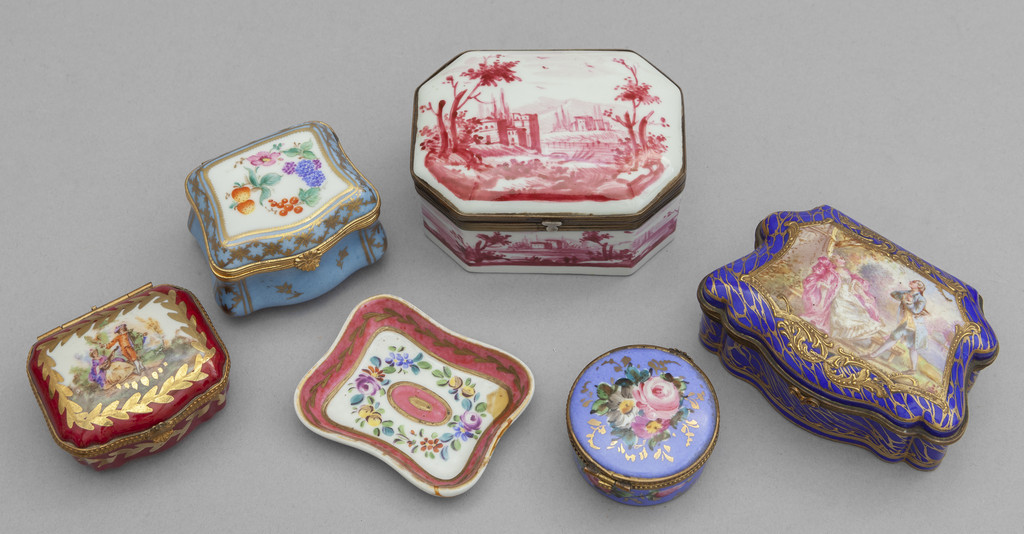 Cinque scatolette in porcellana di cui due in porcellana di Sèvres e una più antica decorata a paesaggi in rosso su fondo bianco