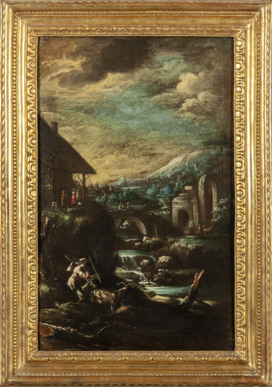 Scuola veneta sec.XVIII 'Paesaggio con fiume animato da molte figure' olio