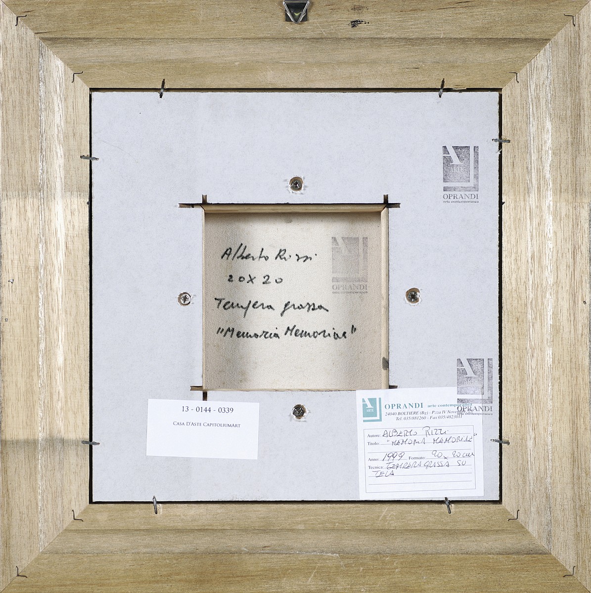 RIZZI ALBERTO (1954 - 2003) Memoria. Tempera su tela. Cm 20,00 x 20,00. Titolo, firma e cartiglio galleria Oprandi Arte, Fino del Monte (BG), al retro. Cornice presente