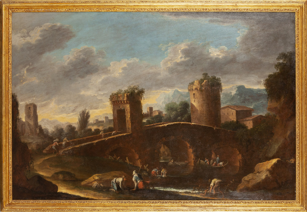 Scuola veneta sec.XVII (Crescenzo Onofri?) 'Paesaggio con ponte animato da molte figure' olio