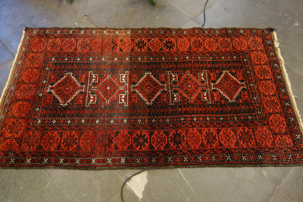 Tappeto boukara a fondo rosso decorato al centro con cinque rombi sec.XX
