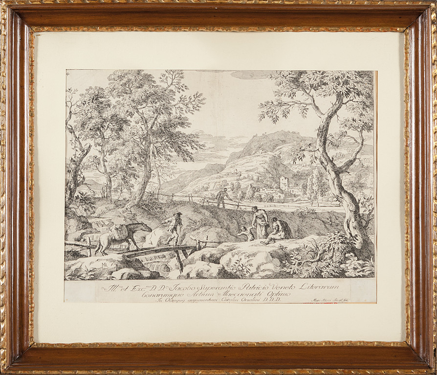 M.Ricci 'Paesaggio campestre' acquaforte s.ta in b.a sn. cornice antica in legno naturale e dorato
