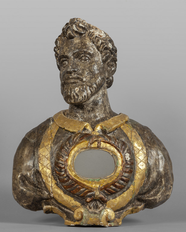 Busto di Santo reliquario in legno intagliato dorato e argentato sec.XVII