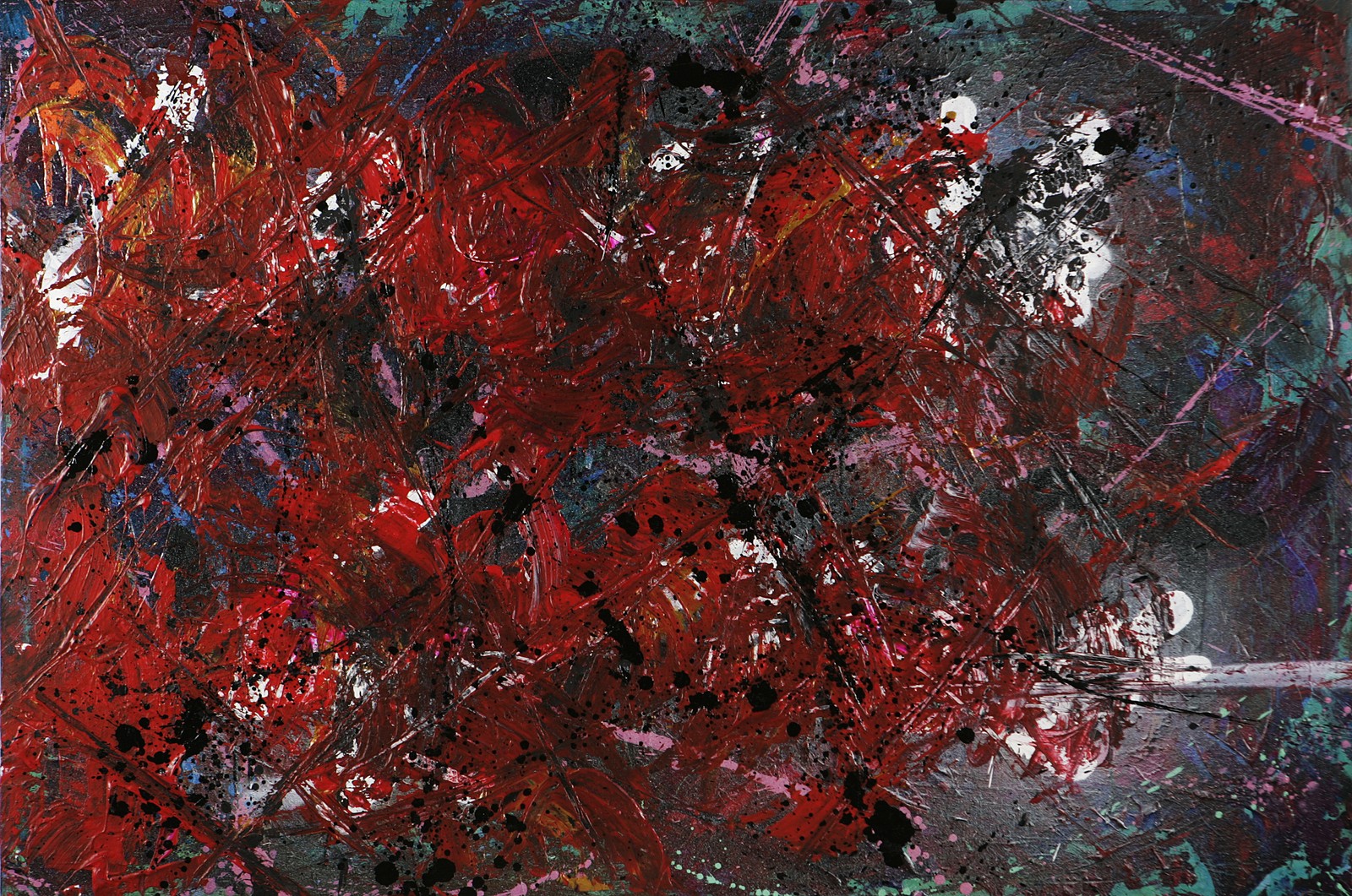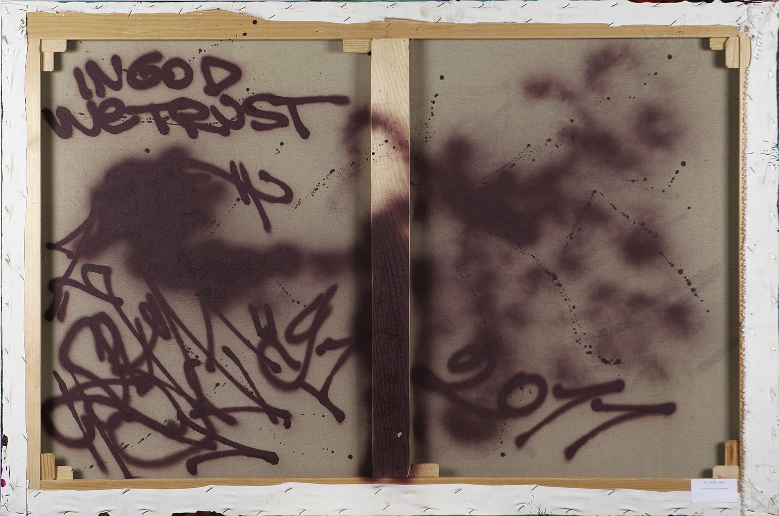 FLY CAT (LUCA MASSIRONI) (n. 1970) In god we trust. 2011. Tecnica mista su tela. Cm 80,00 x 120,00. Al retro firma, titolo e data.