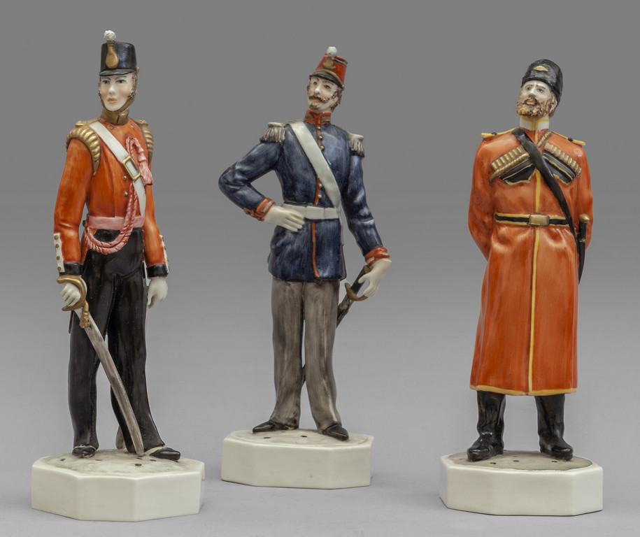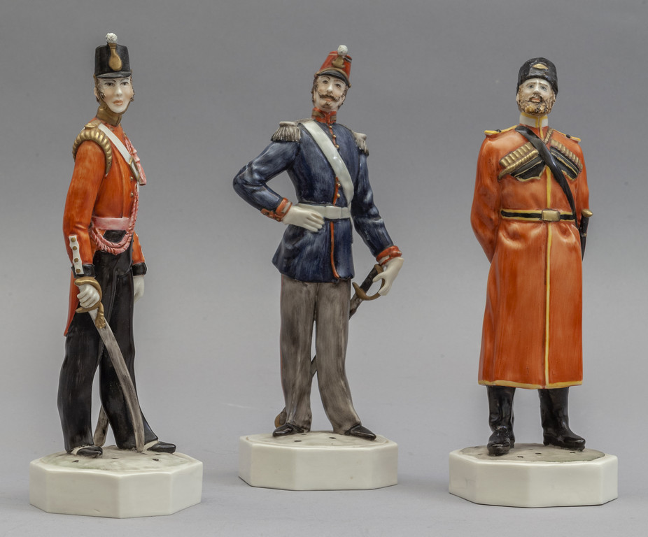 Cacciapuoti tre statuine in porcellana policroma raffiguranti militari f.ti sotto la base
