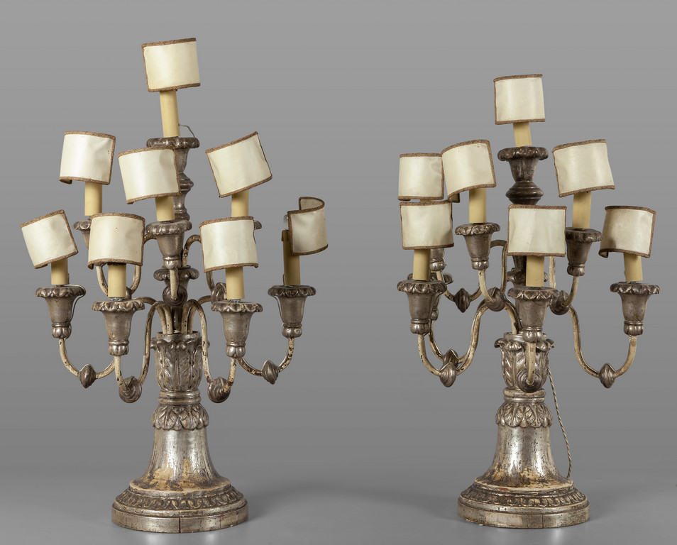 Coppia di grandi candelabri a otto luci in legno intagliato e argentato Genova inizi sec.XIX