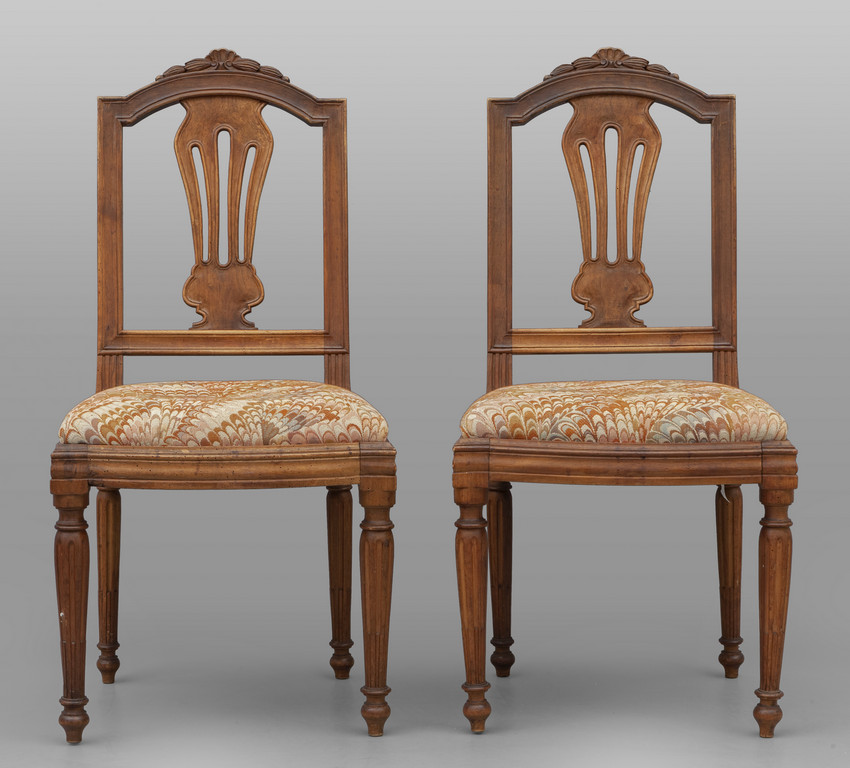 Cinque sedie Luigi XVI in noce schienale a stecca Genova II metà sec.XVIII più cinque in stile