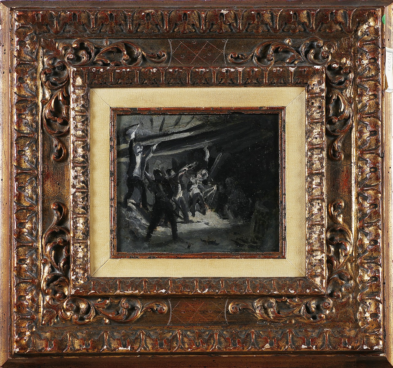 RIZZI ANTONIO (1869 - 1940) Un interno di miniera. Olio su tavola. Cm 21,00 x 18,00. Firma in basso a destra. . Cornice presente
