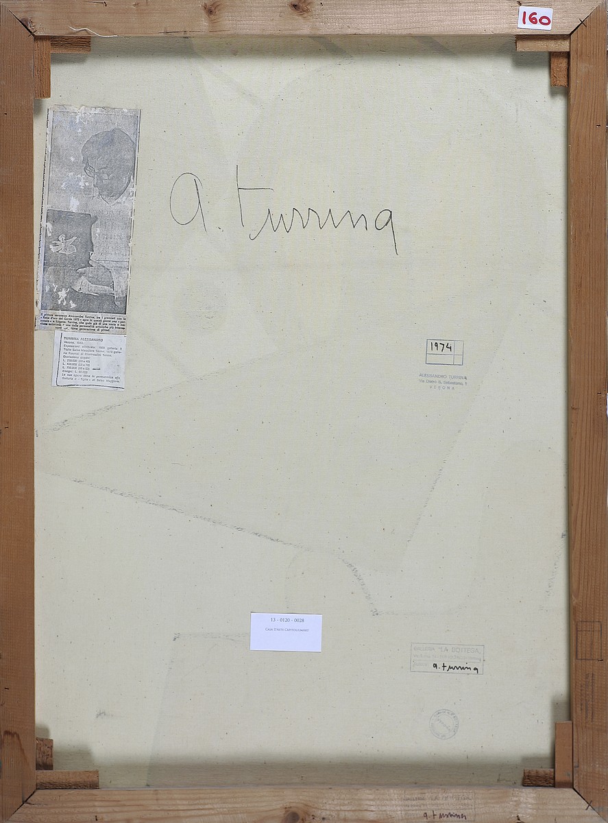 TURRINA ALESSANDRO (n. 1940) Senza titolo. Olio su tela . Cm 60,00 x 80,00 x 1,50. Al retro firma, timbro della Galleria La Bottega, Verona e cartiglio descrittivo della vita dell'artista.