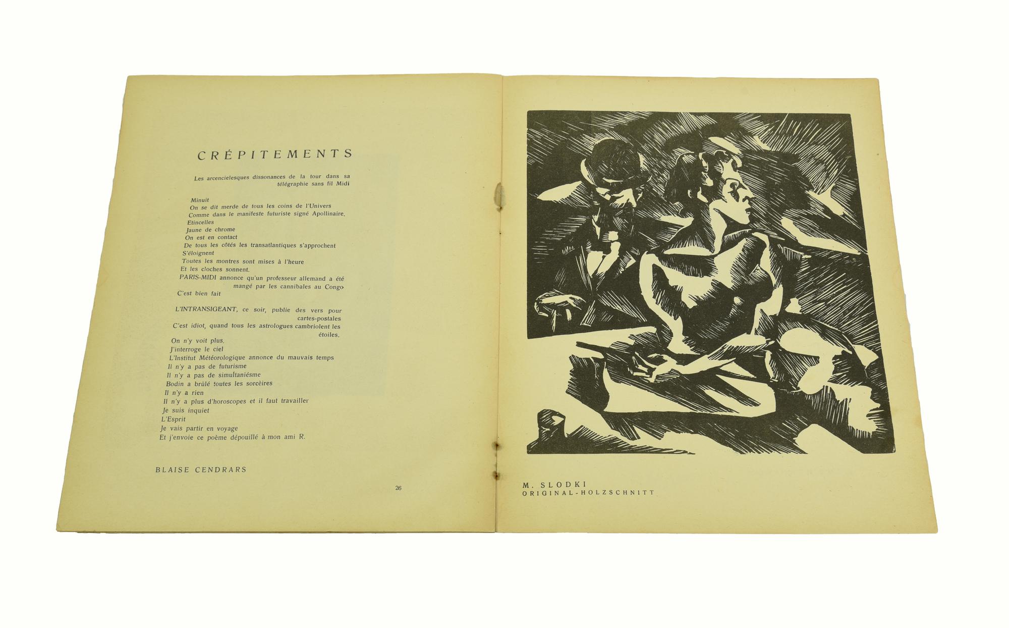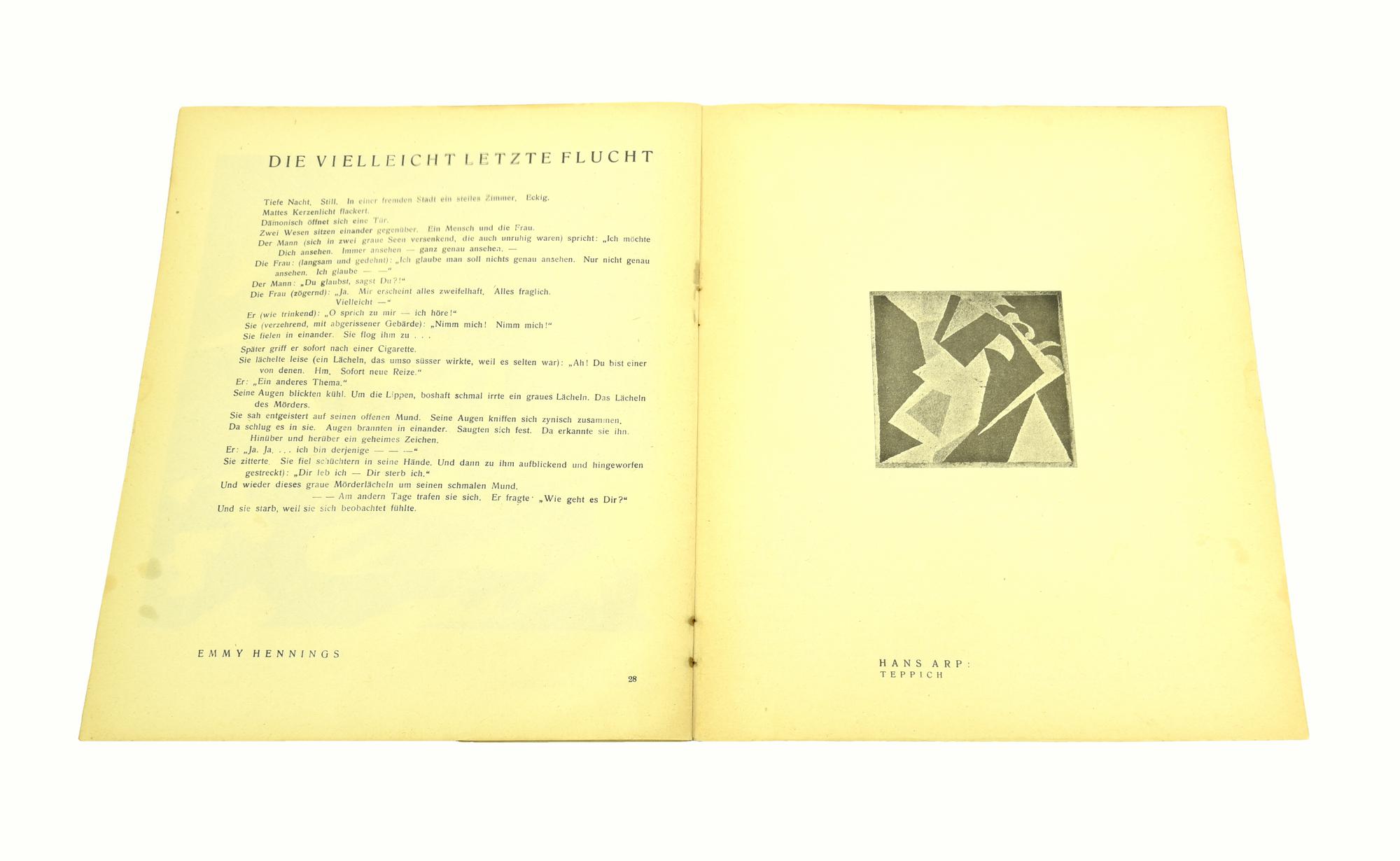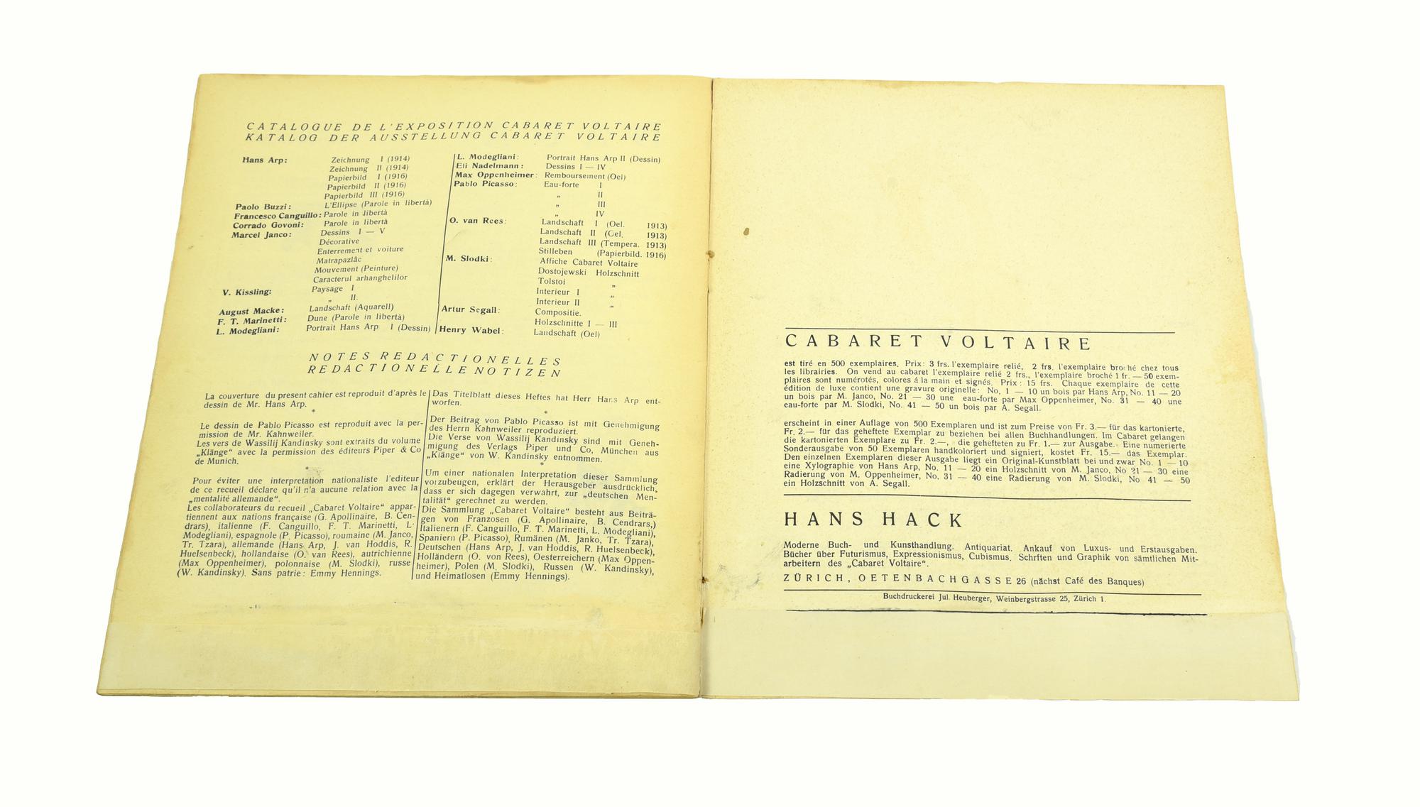 La copertina è illustrata da un disegno di Arp, tirato su fondo di carta laminata, color rame. Edizione originale dell'unico numero di questa raccolta letteraria e artistica pubblicata da Hugo Ball a Zurigo nel 1916.