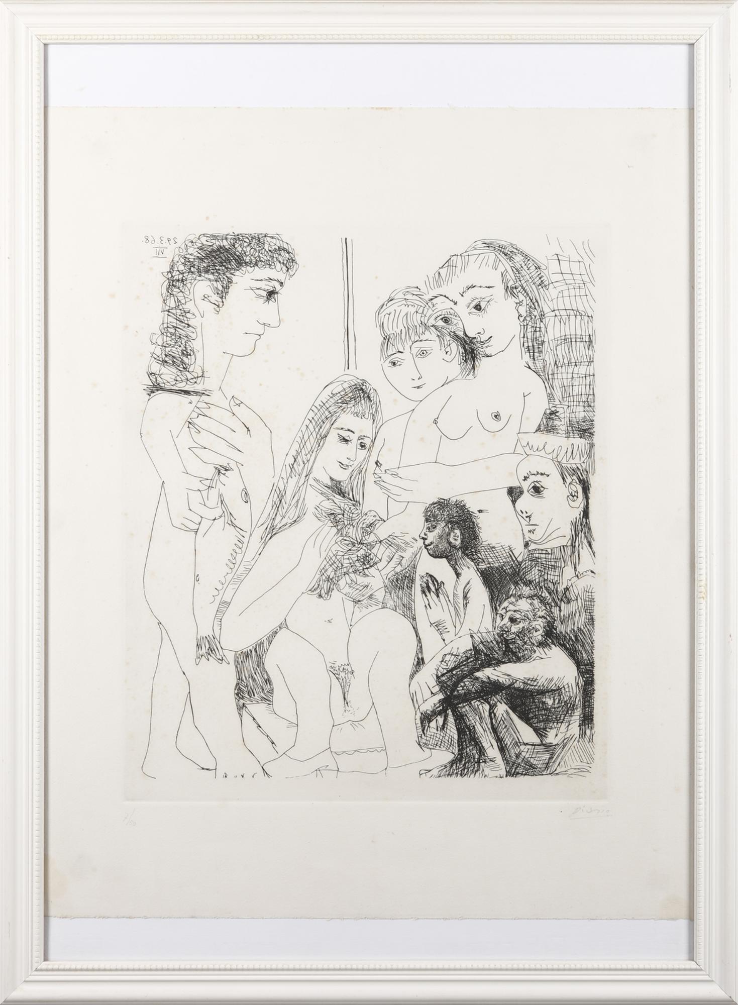 7/50. Tiratura e firma in basso a matita. Anno in lastra in alto a sinistra. Dimensione lastra: 43.4x36.2 cm. Editore: Galerie L. Leiris, Parigi. Edizione totale: 50 esemplari +17 prove d'artista. La grafica provenienza dalla Suite 347: opera composta da 347 incisioni realizzate tra il Marzo e l'Ottobre del 1968. La suite è composta da quattro grandi nuclei tematici: La Celestina, ovvero le stampe selezionate da Picasso per un'edizione della Celestina di Fernando de Rojas; Picasso, la sua opera e il suo pubblico, una sorta di presentazione dei soggetti principali e di tutte le tecniche e gli stili utilizzati; Mitologia e circo, in cui affiorano la mitologia mediterranea e i tradizionali temi picassiani ed, infine, Il pittore e le modelle. Difetti.
