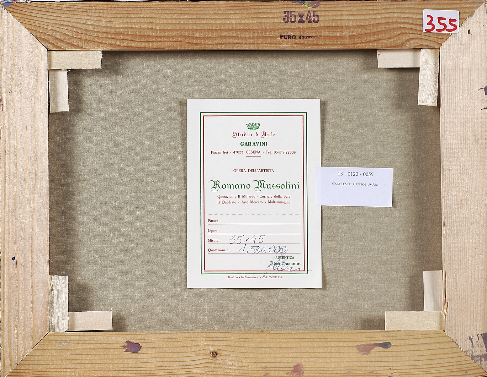MUSSOLINI ROMANO (1927 - 2008) Paesaggio. Olio su tela . Cm 45,00 x 35,00. Firma in basso a sinistra. Al retro certificato di autenticità dell'opera a cura dello Studio d'Arte Garavini, Roma.
