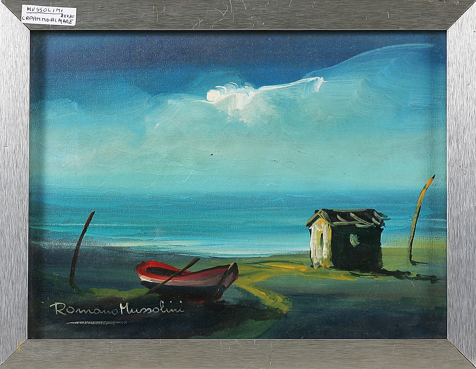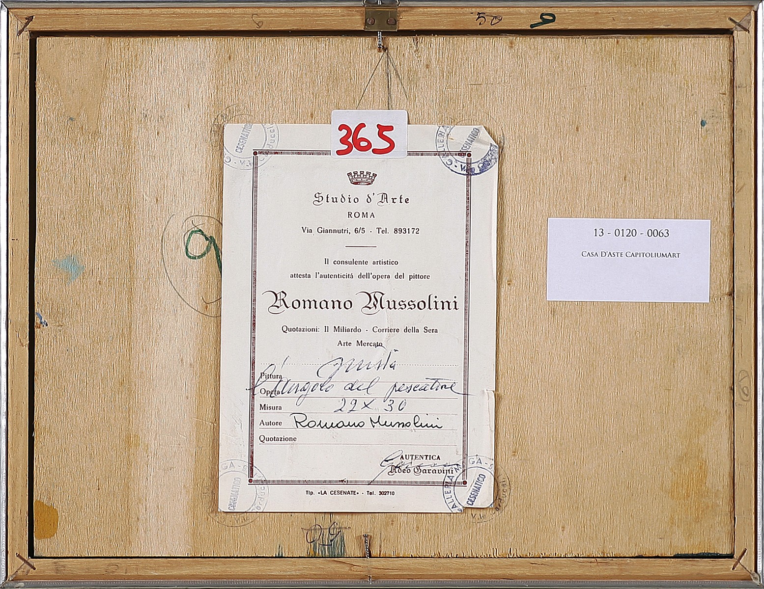 MUSSOLINI ROMANO (1927 - 2008) L'angolo del pescatore. Tecnica mista su tavola. Cm 30,00 x 22,00. Firma in basso a sinistra. Al retro certificato di autenticità a cura dello Studio d'arte Garavini, Roma. Cornice presente