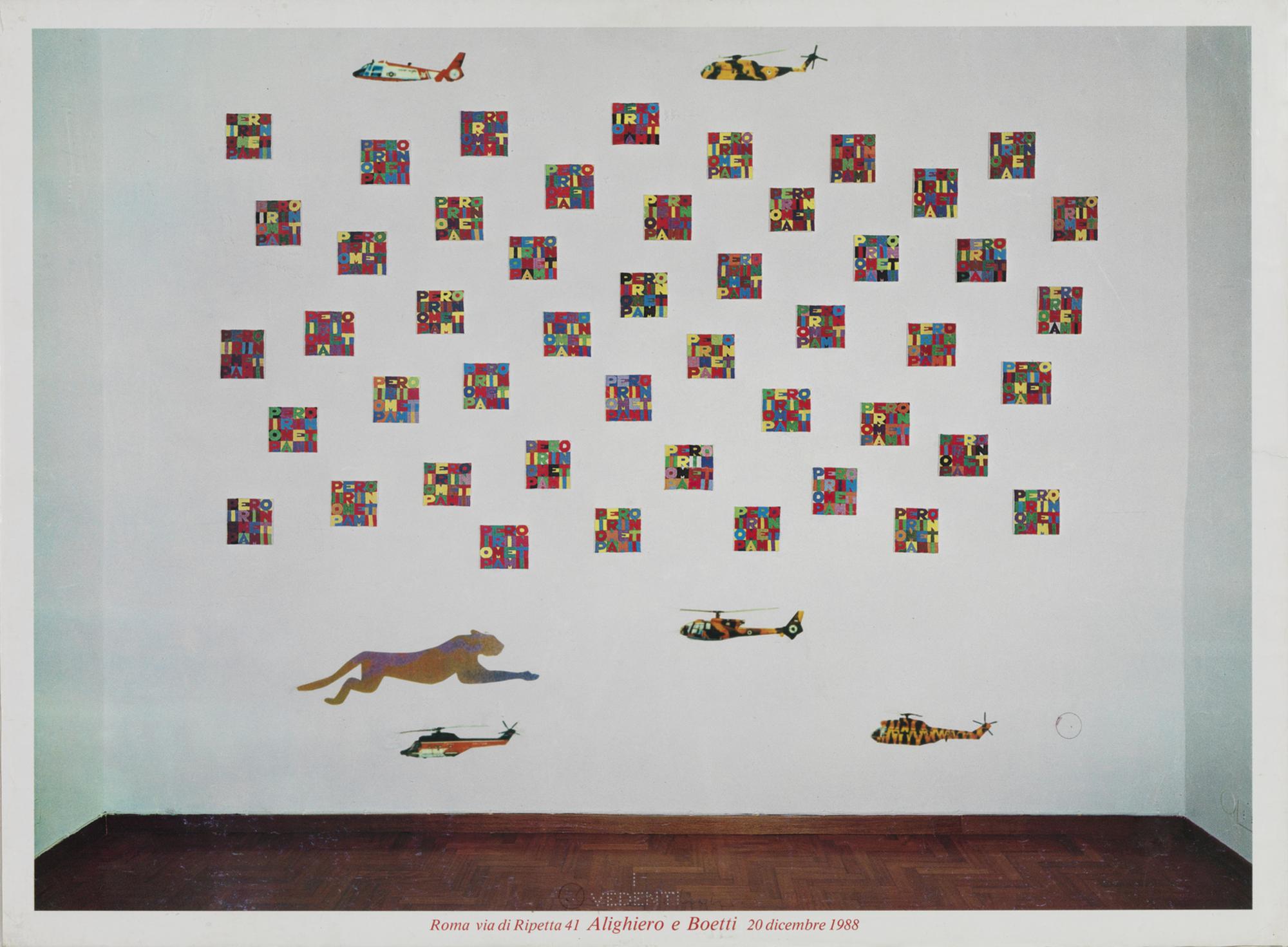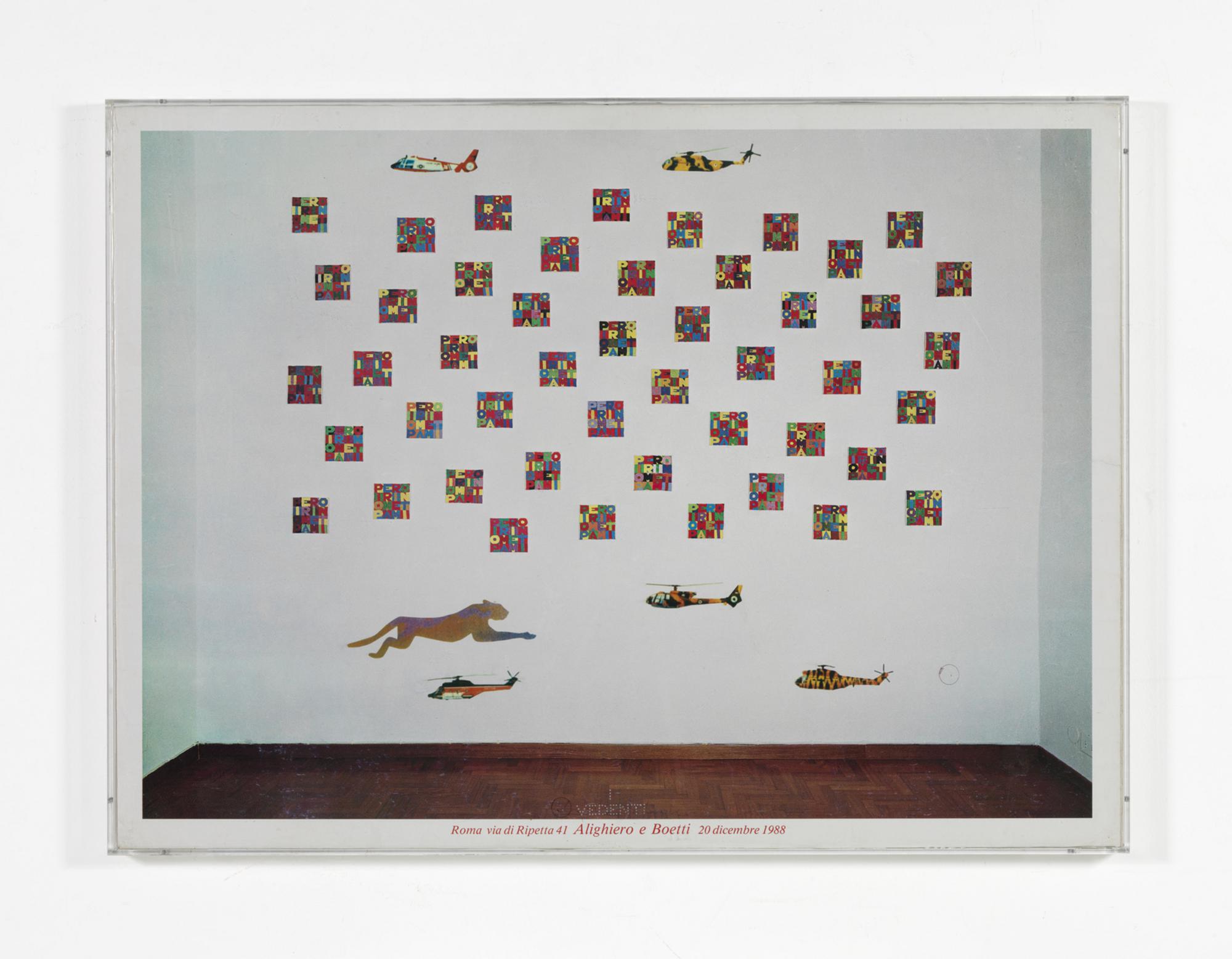 Opera archiviata presso l'Archivio Alighiero Boetti, Roma, come da documentazione fotografica allegata all'opera riportante il relativo numero d'inventario. Entra teca di plexiglass. L'intervento manuale dell'artista a collage corrisponde alla tigre in basso a sinistra e ai cinque elicotteri.