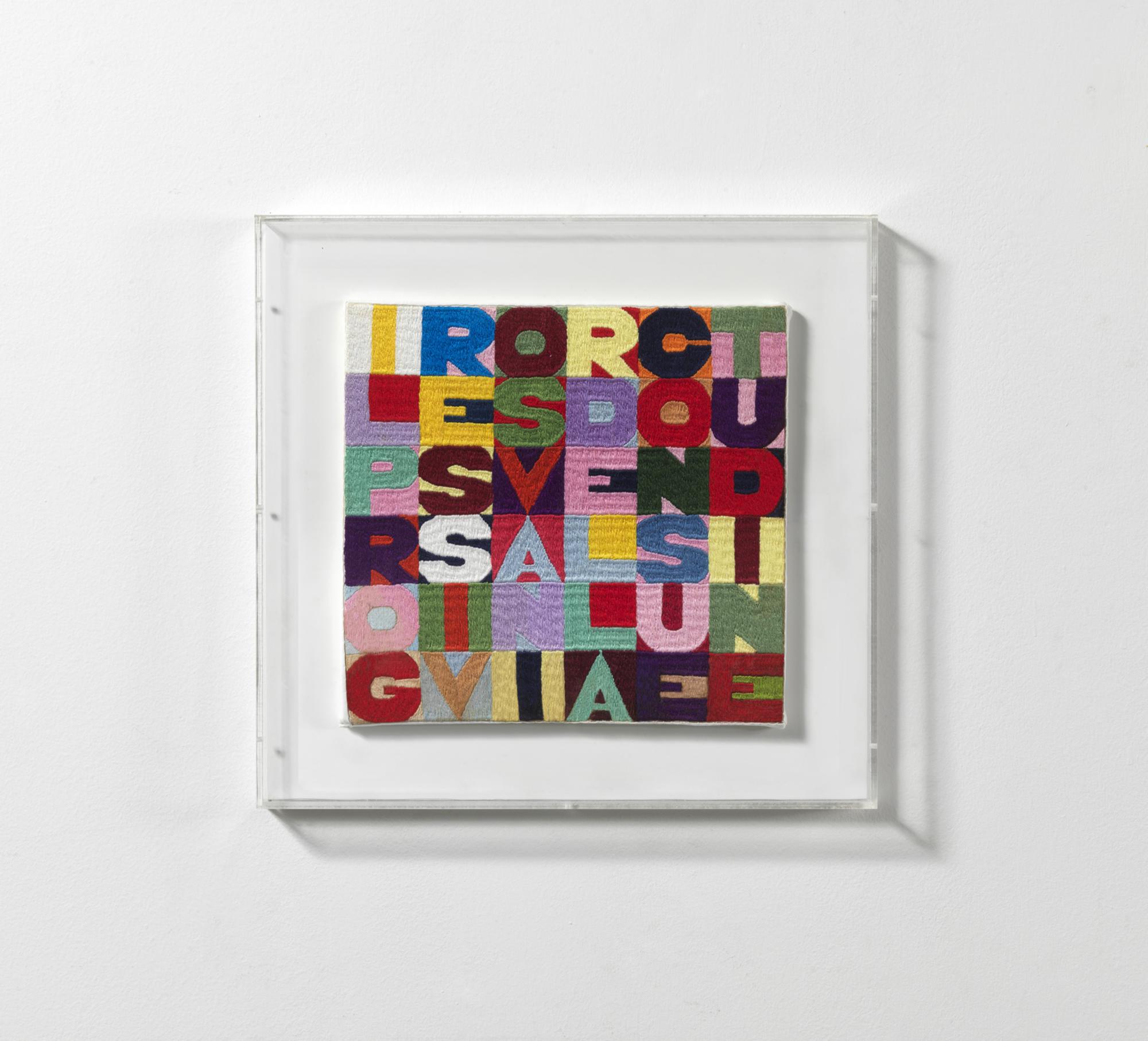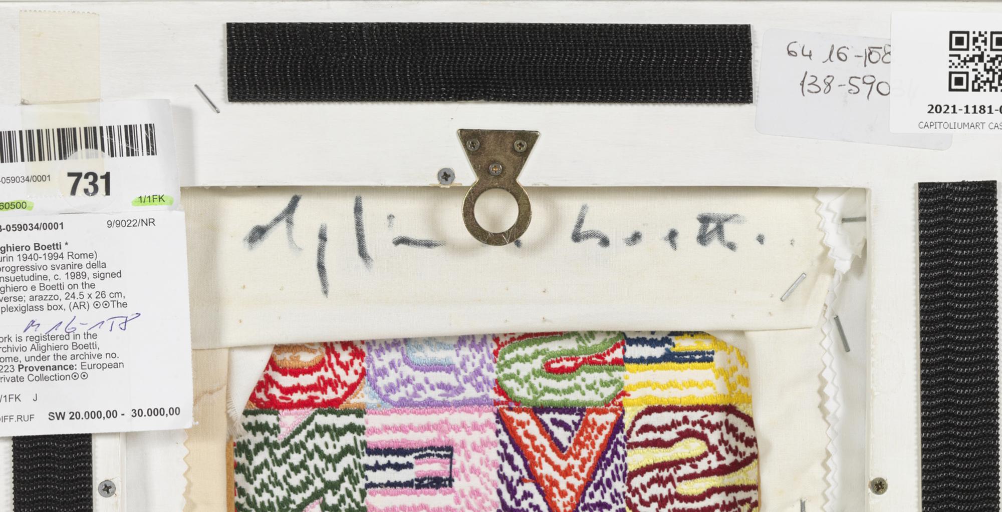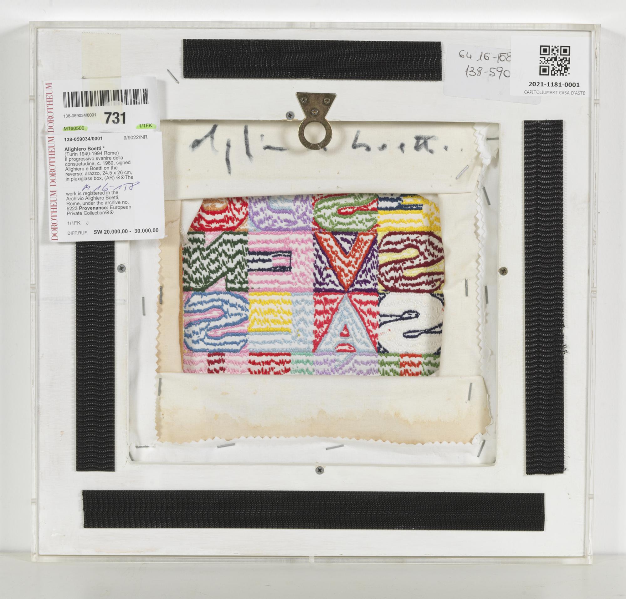 Firma al retro. Opera archiviata presso l'Archivio Alighiero Boetti, Rome, come da documentazione fotografica allegata all'opera riportante il relativo numero d'inventario (duplicato) . Entro teca di plexiglass.