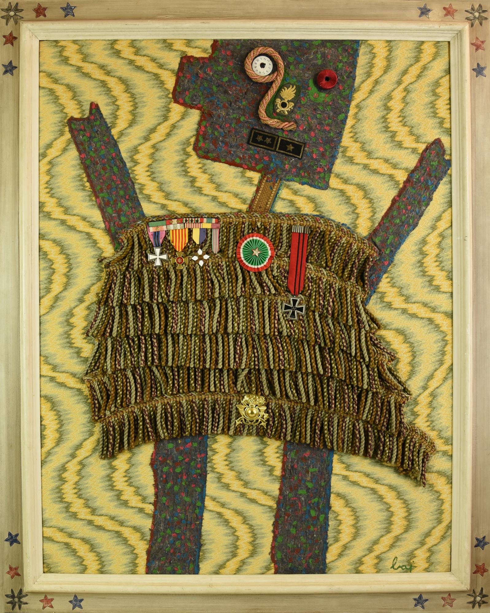 olio, stoffa, passamaneria e medaglie su tela, cm 115x89