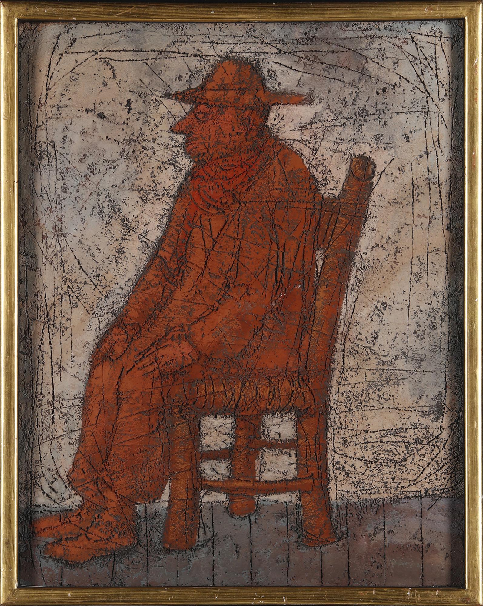 Domenico Gnoli (1933 - 1970) PICCOLO UOMO CON SCIARPA ROSSA tecnica mista su...
