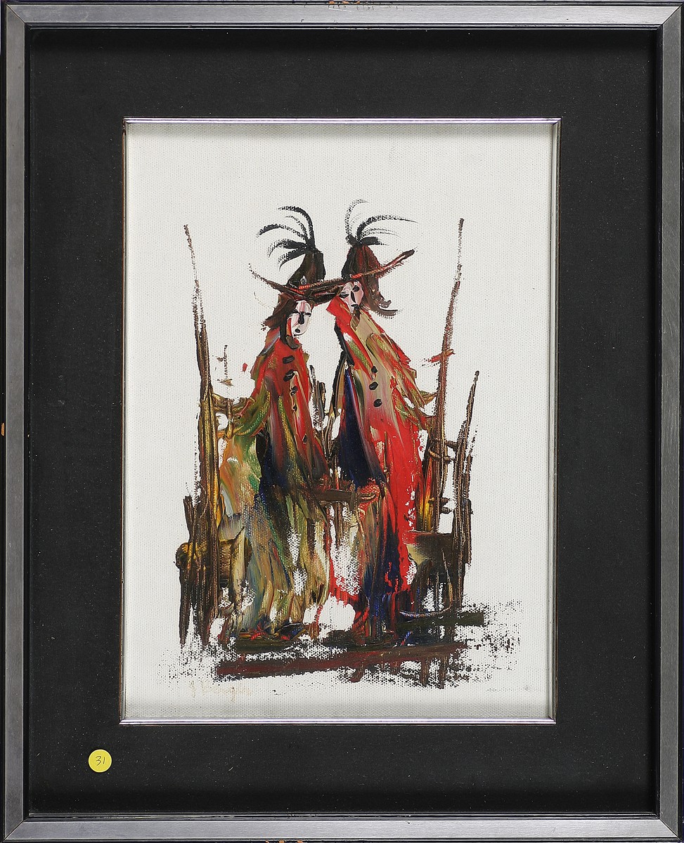 ANONIMO Due personaggi. Olio su tela . Cm 35,00 x 25,00. Firma illeggibile in...