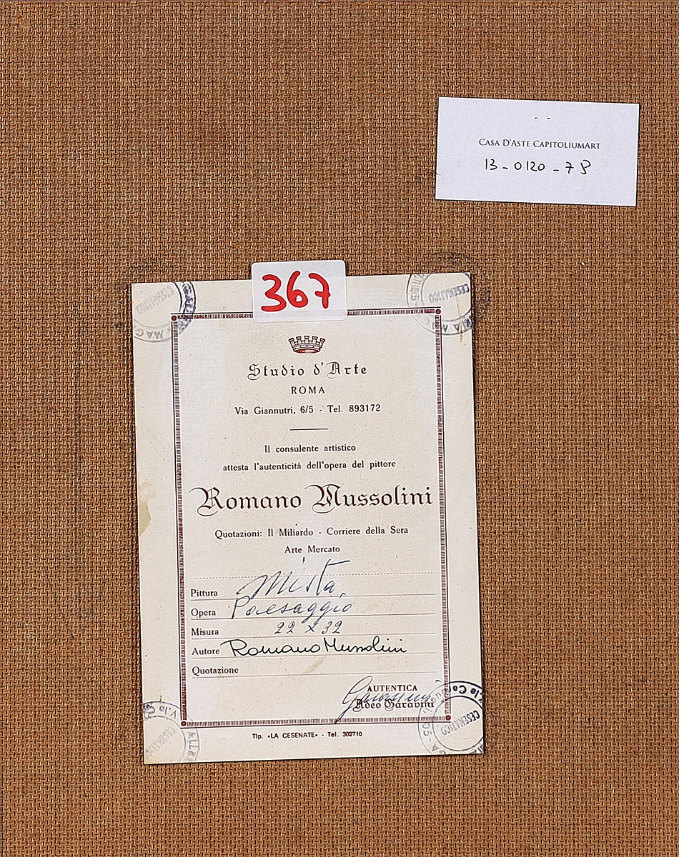 MUSSOLINI ROMANO (1927 - 2008) Alberi. Olio su tavola. Cm 24,00 x 30,00. Firma in basso a sinistra. Al retro certificato di autenticità dell'opera a cura dello Studio d'Arte Garavini, Roma.