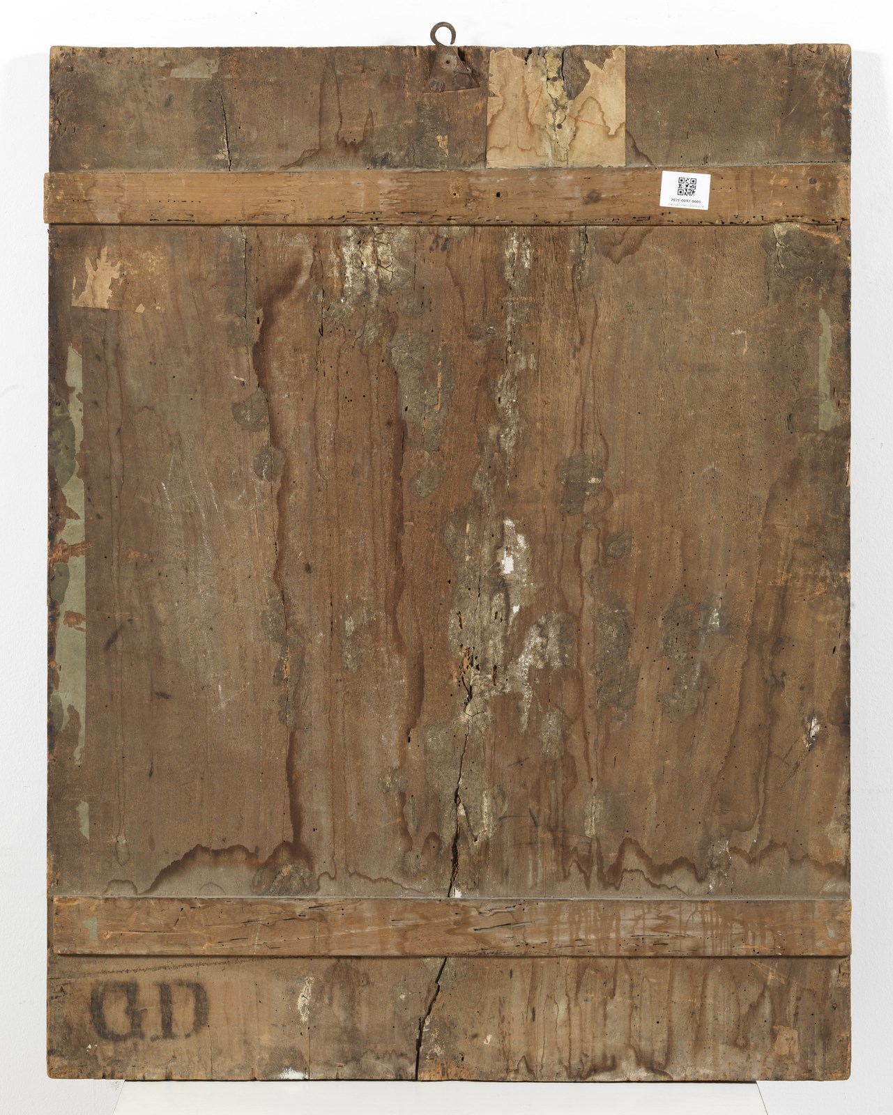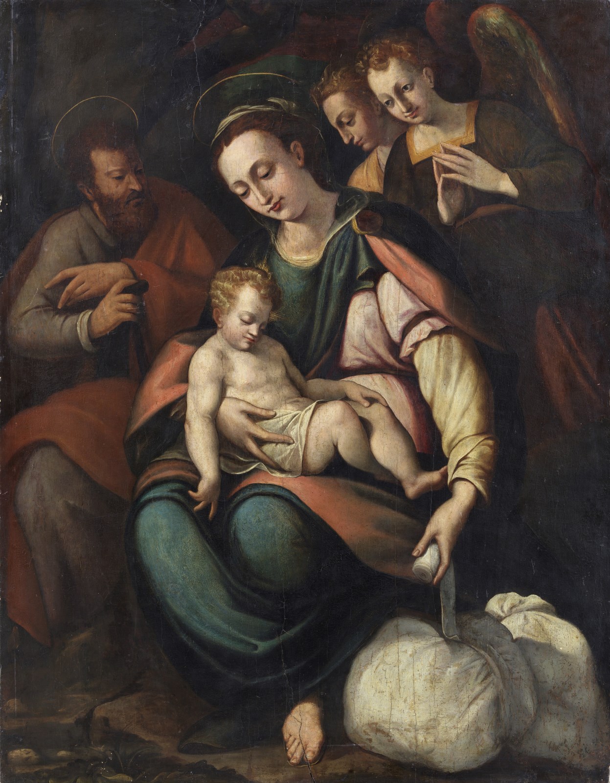 ARTISTA TOSCANO DEL XVI SECOLO Madonna con il bambino, San Giuseppe e gli angeli. . Olio su tavola. Cm 88,50 x 114,50 x 3,00. L’opera è riconducibile alla cerchia di Santi di Tito (1536-1603), pittore ed architetto che divenne una personalità di spicco nella Firenze e la Toscana della seconda metà del Cinquecento.