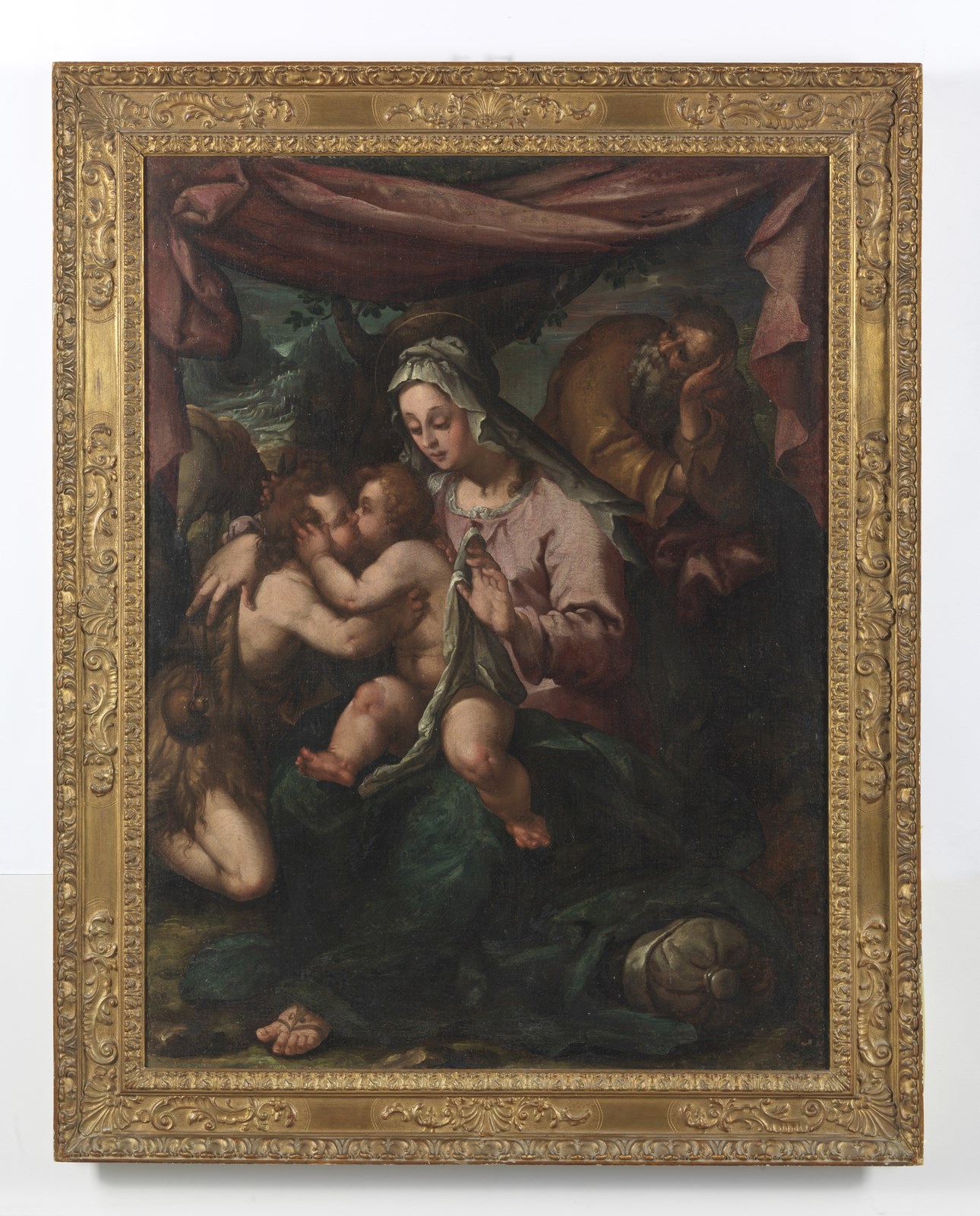 ARTISTA DEL XVI SECOLO Madonna con Bambino, San Giovanni e San Giuseppe. Olio su tela . Cm 73,00 x 98,00. . Cornice presente
