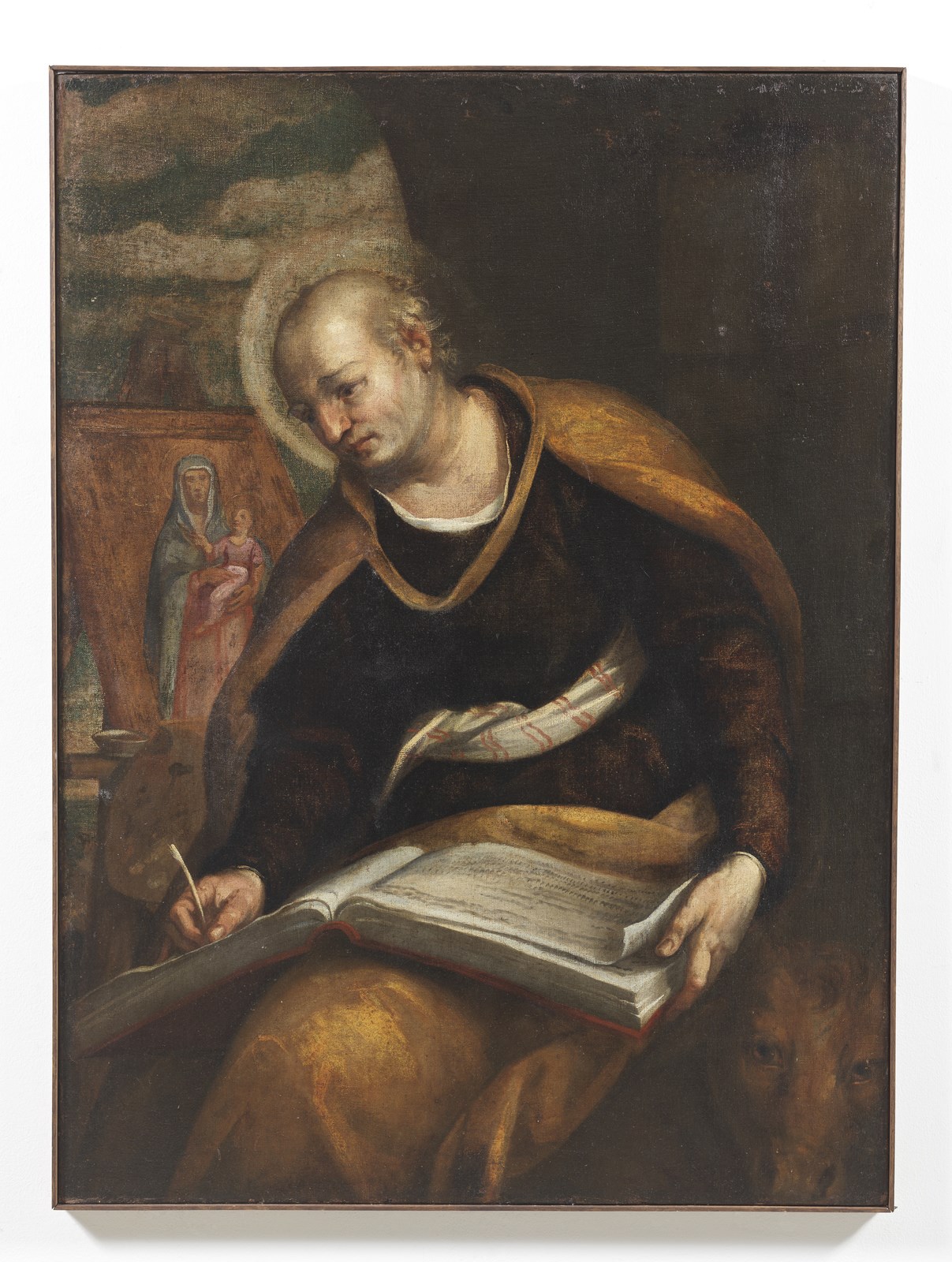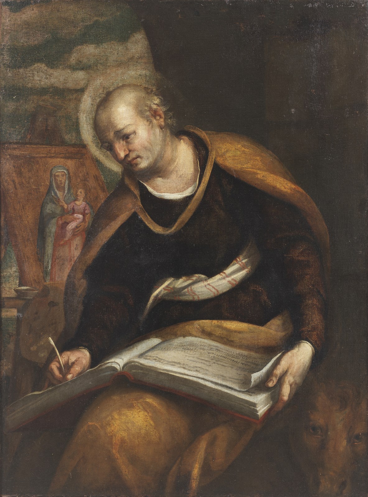 ARTISTA VENETO DEL XVI SECOLO San Luca. Olio su tela . Cm 98,00 x 132,00. La tela raffigura l’evangelista Luca con gli attributi che tradizionalmente lo identificano. Il bue occhieggia nell’angolo inferiore, mentre sul fondo si riconoscono la tavolozza dei colori e un cavalletto su cui è posta l’effigie dipinta di una Madonna col Bambino, ad evocare così la narrazione antica che vede in San Luca il primo iconografo di Maria, che gli valse il titolo di patrono degli artisti.
