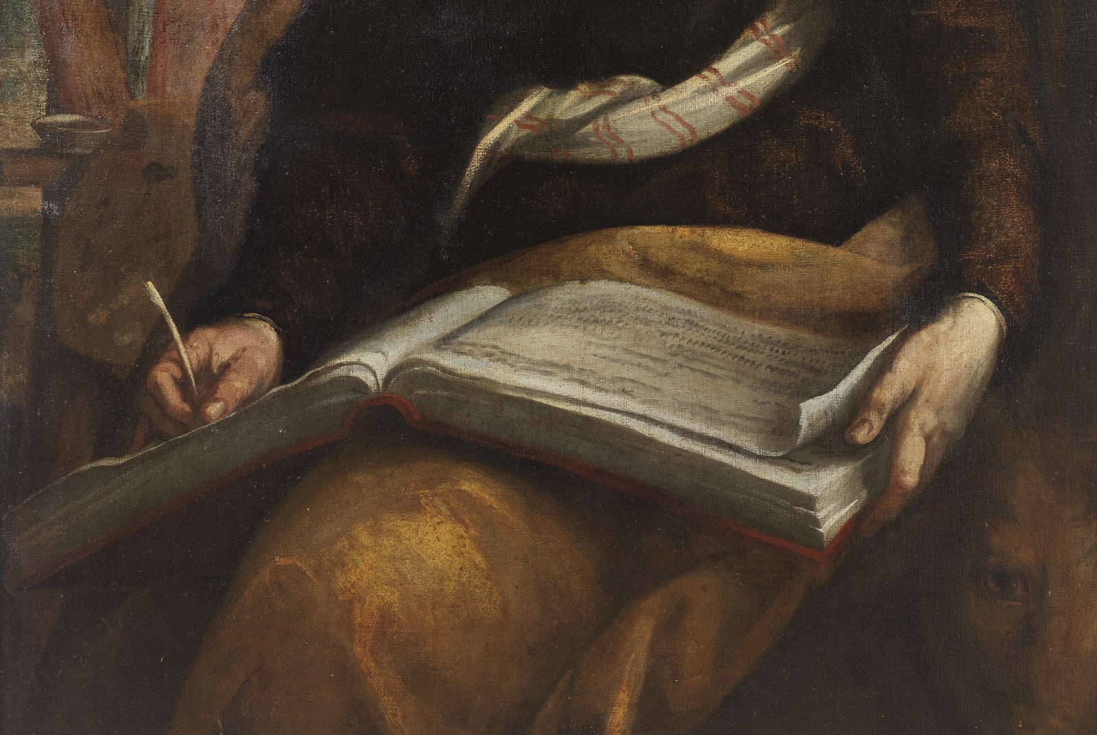 Le forme fisionomiche generose così come la postura piegata e spinta in avanti dell’evangelista sono rese con una pennellata spedita, magra e sapiente. Dati stilistici che appartengono alla scuola veneta nello snodo d’anni tra Cinque e Seicento. Un riferimento all’ambito di Domenico Tintoretto (1560-1635), figlio primogenito del celebre Jacopo, potrebbe dunque essere una valida direzione di ricerca sull’identità dell’anonimo autore di quest’opera.