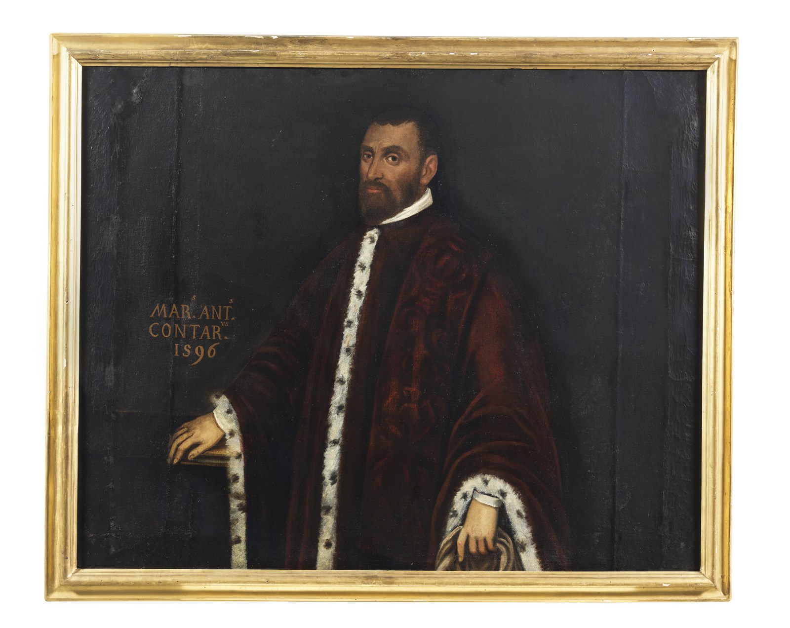 ARTISTA VENETO DEL XVI SECOLO Ritratto del senatore della Repubblica di Venezia Marcantonio Contarini. . Olio su tela . Cm 138,00 x 110,00. Riporta a sinistra la dicitura "Mar. Ant. Contar. 1596". Cornice presente