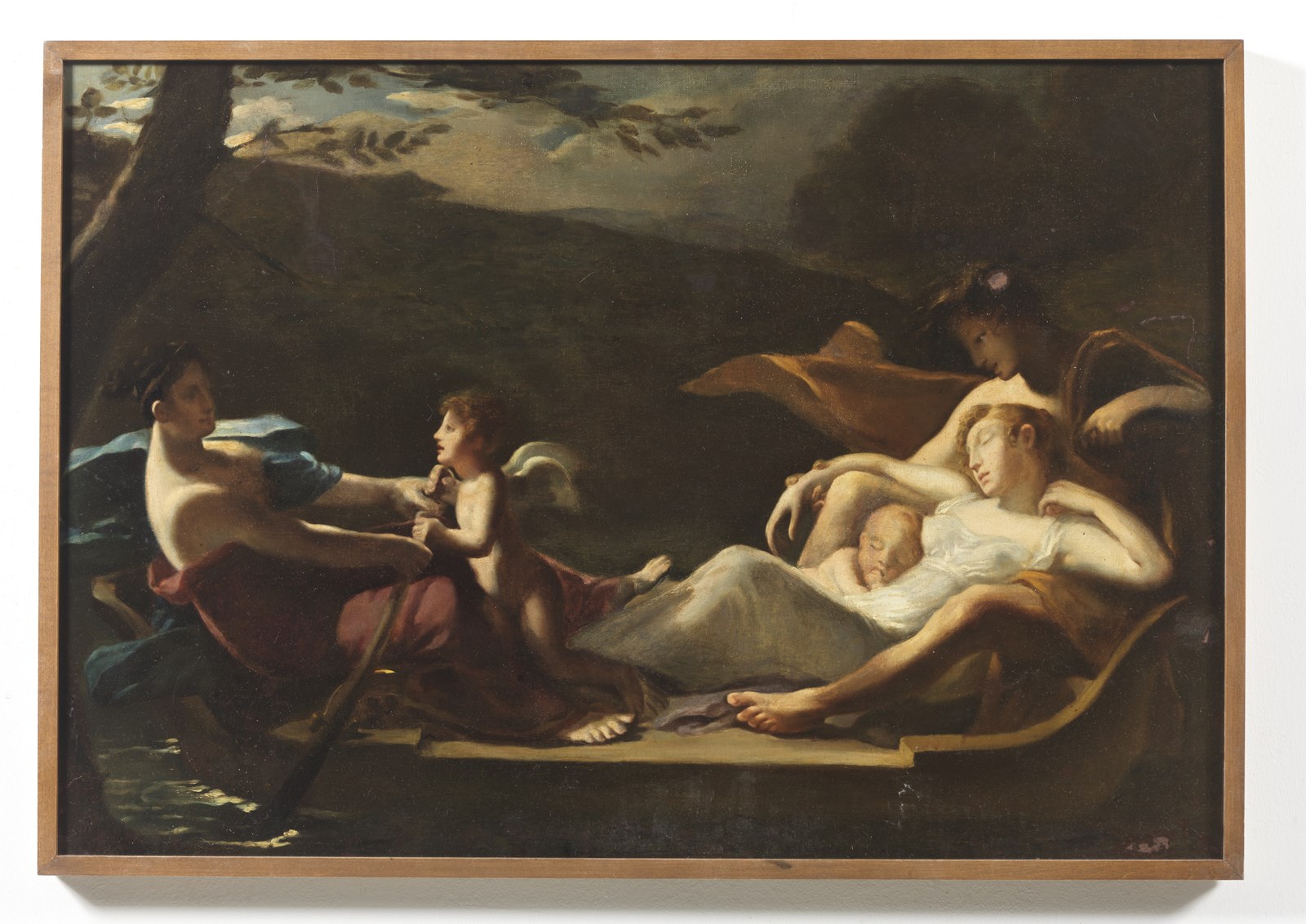 ARTISTA DEL XVIII SECOLO Paesaggio fluviale con personaggi. Olio su tela . Cm 90,00 x 63,00. . Cornice presente