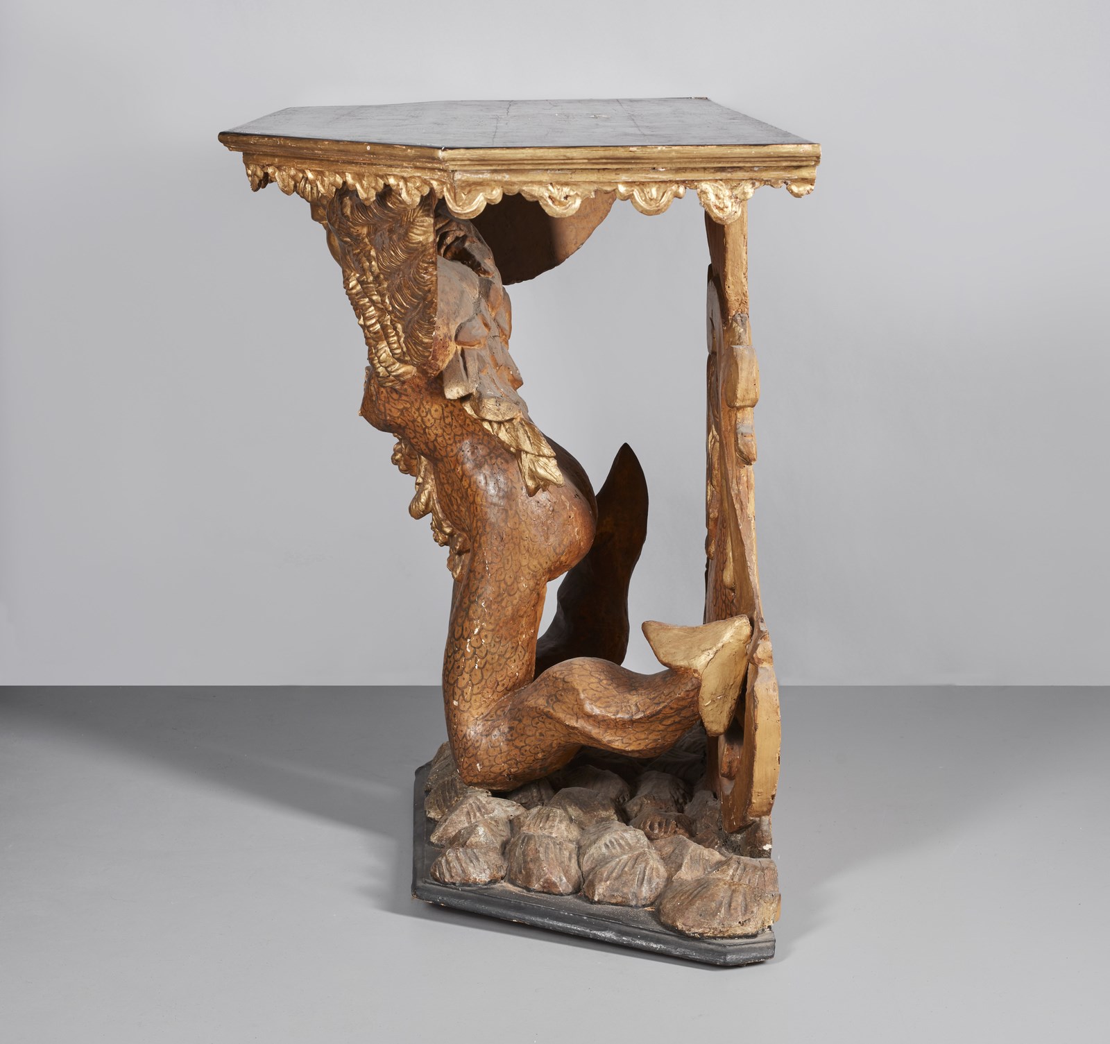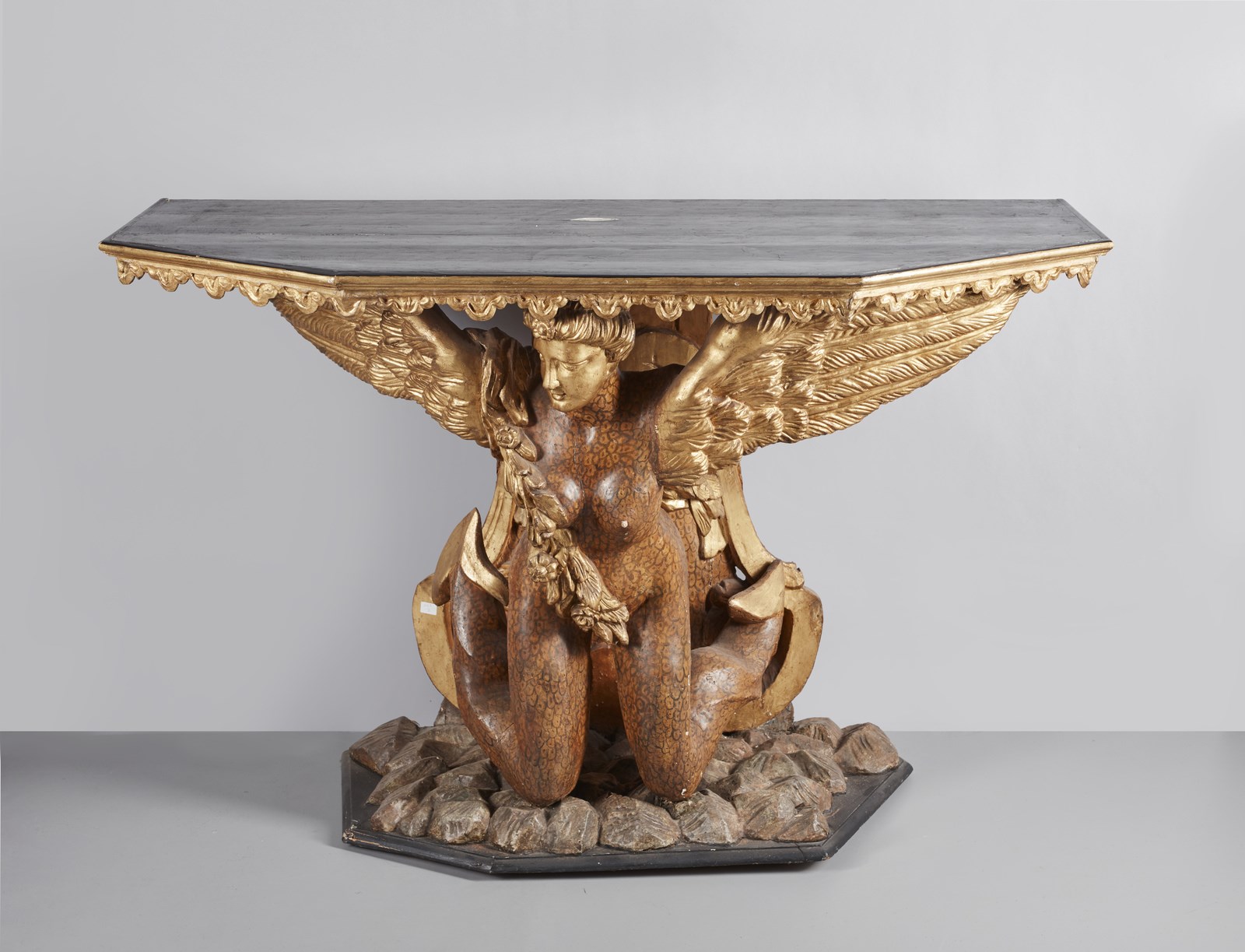 MANIFATTURA ROMANA DEL XVII-XVIII SECOLO Tavolo da parete in legno scolpito e dorato con sostegno in forma di sirena alata e bicaudata. . Cm 136,20 x 91,50 x 60,70. Provenienza: Collezione Chigi, Ariccia; Collezione privata, Roma.