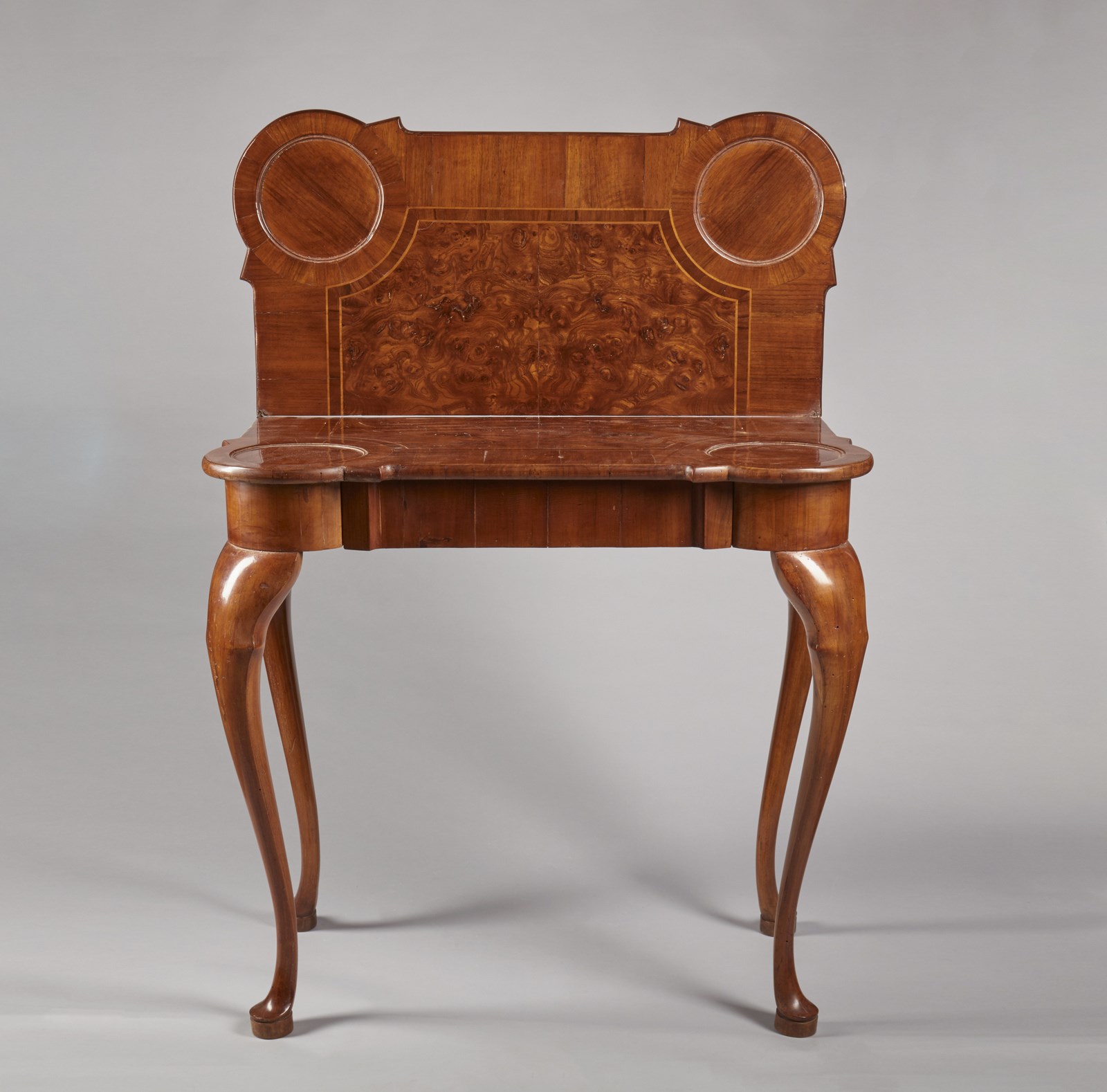 MANIFATTURA FERRARESE DEL XVIII SECOLO - Tavolino da gioco lastronato in radica di noce con piano sagomato apribile e cassetto sul fronte, gambe arcuate.