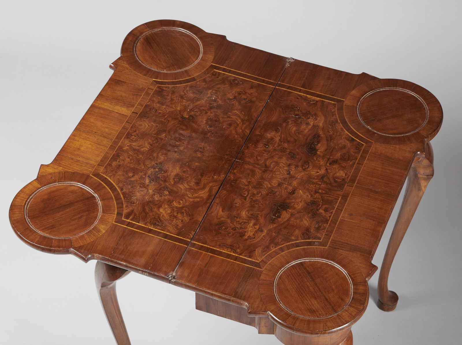 MANIFATTURA FERRARESE DEL XVIII SECOLO Tavolino da gioco lastronato in radica di noce con piano sagomato apribile e cassetto sul fronte, gambe arcuate. . Cm 77,00 x 73,50 x 40,50. Restauri.