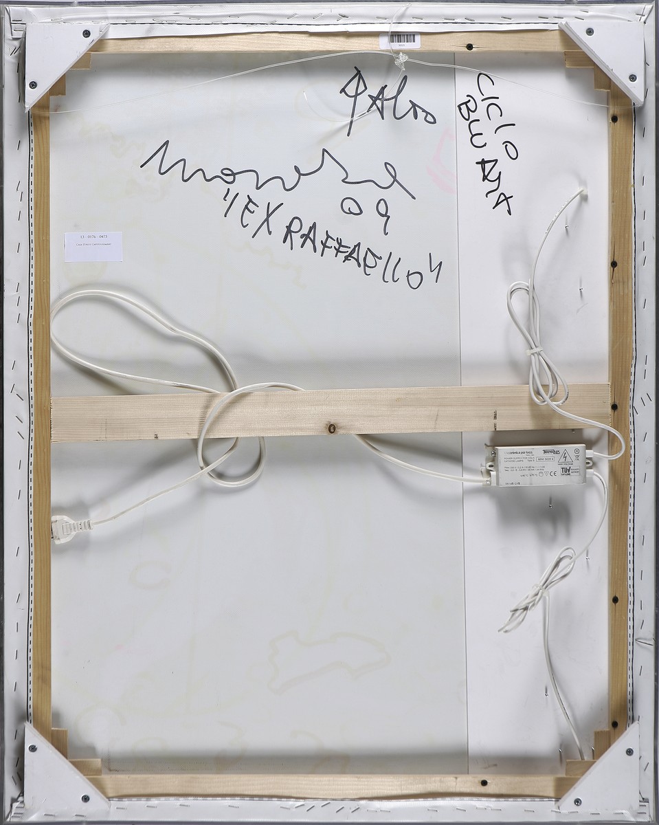 MANERA ENRICO (n. 1947) Ex Raffaello. Ciclo Blu Art. 2009. Smalti e neon su tela emulsionata. Cm 85,00 x 105,00. Al retro titolo, firma e anno. Entro teca di plexiglass. Opera archiviata presso l'archivio fotografico generale delle opere di Enrico Manera coma da documentazione fotografica allegata all'opera riportante il relativo n. d'inventario.