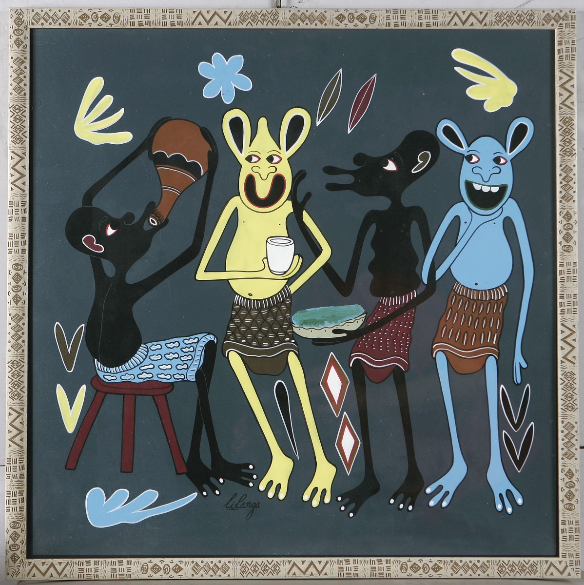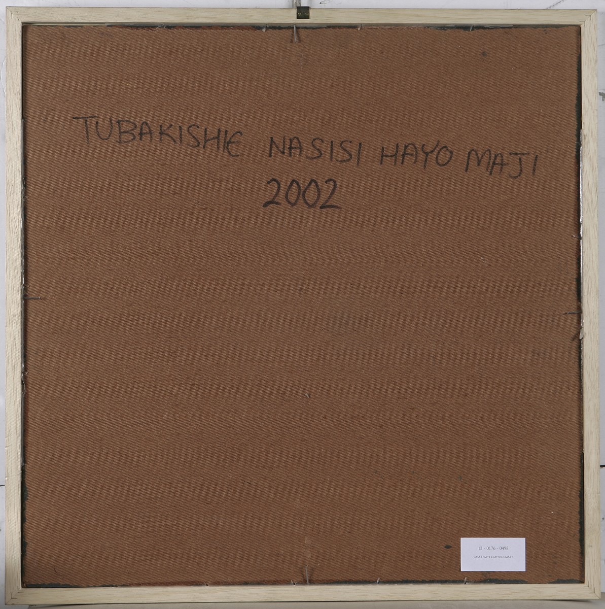 LILANGA GEORGE (1940 - 2005) Tubakishie Nasisi Hayo Maji. 2002. Olio su tavola. Cm 61,00 x 61,00. Firma in basso al centro. Al retro titolo e data. Autentica su fotografia di Captain Felix Lorenz. Cornice presente