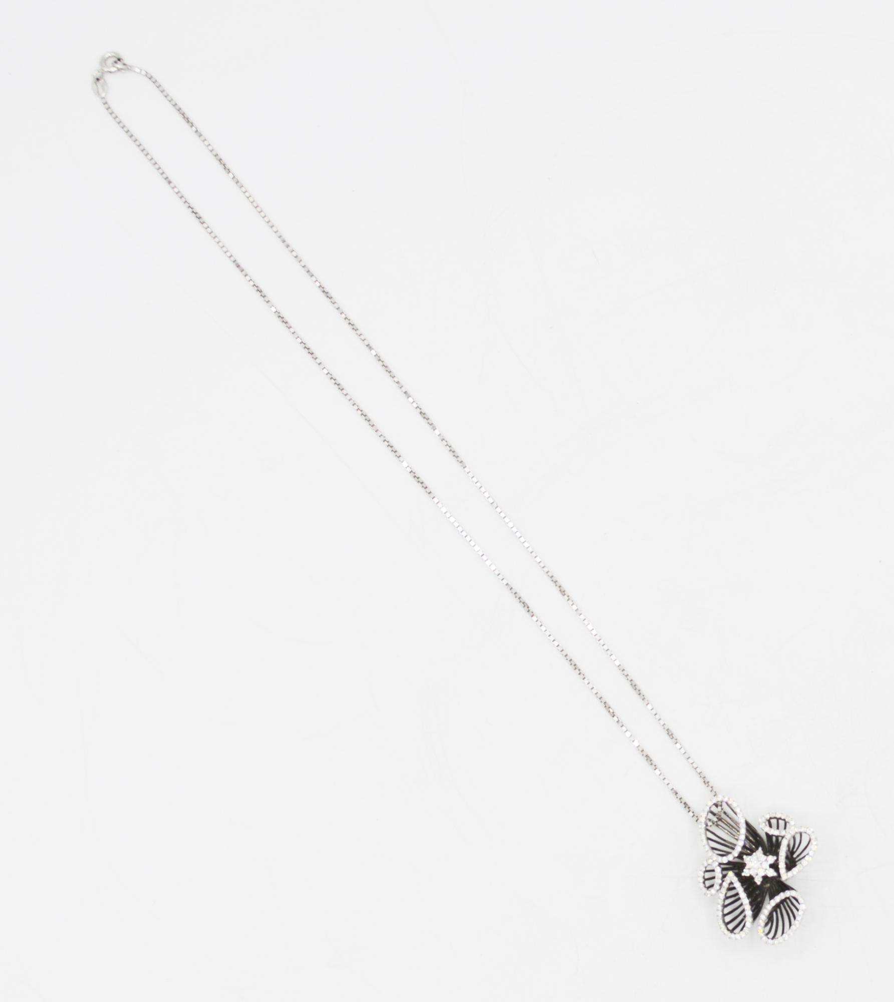 pendente modellato a fiore stilizzato in oro bianco 18kt, 7,76 gr., con diamanti taglio brillante per 0,97 Ct circa, corredato da catenina in oro bianco 18kt