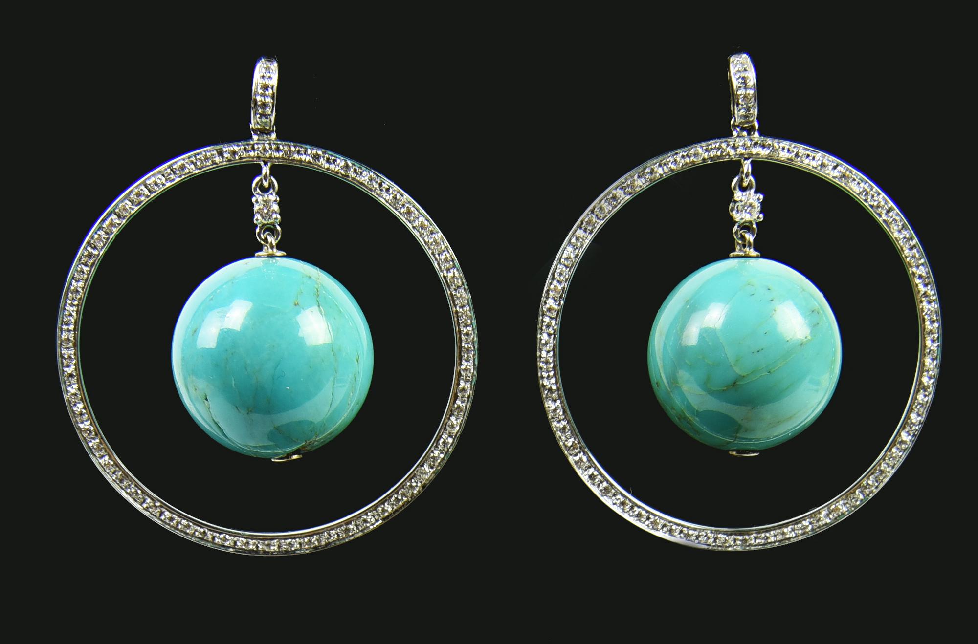 in oro bianco 18 kt con sfere di turchese persiano di 17 mm per 11,30 gr. circa, impreziositi da diamanti taglio brillante per 0,84 ct circa.