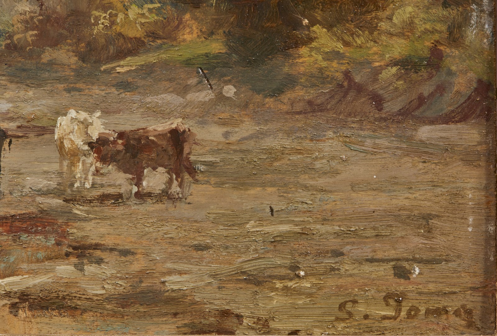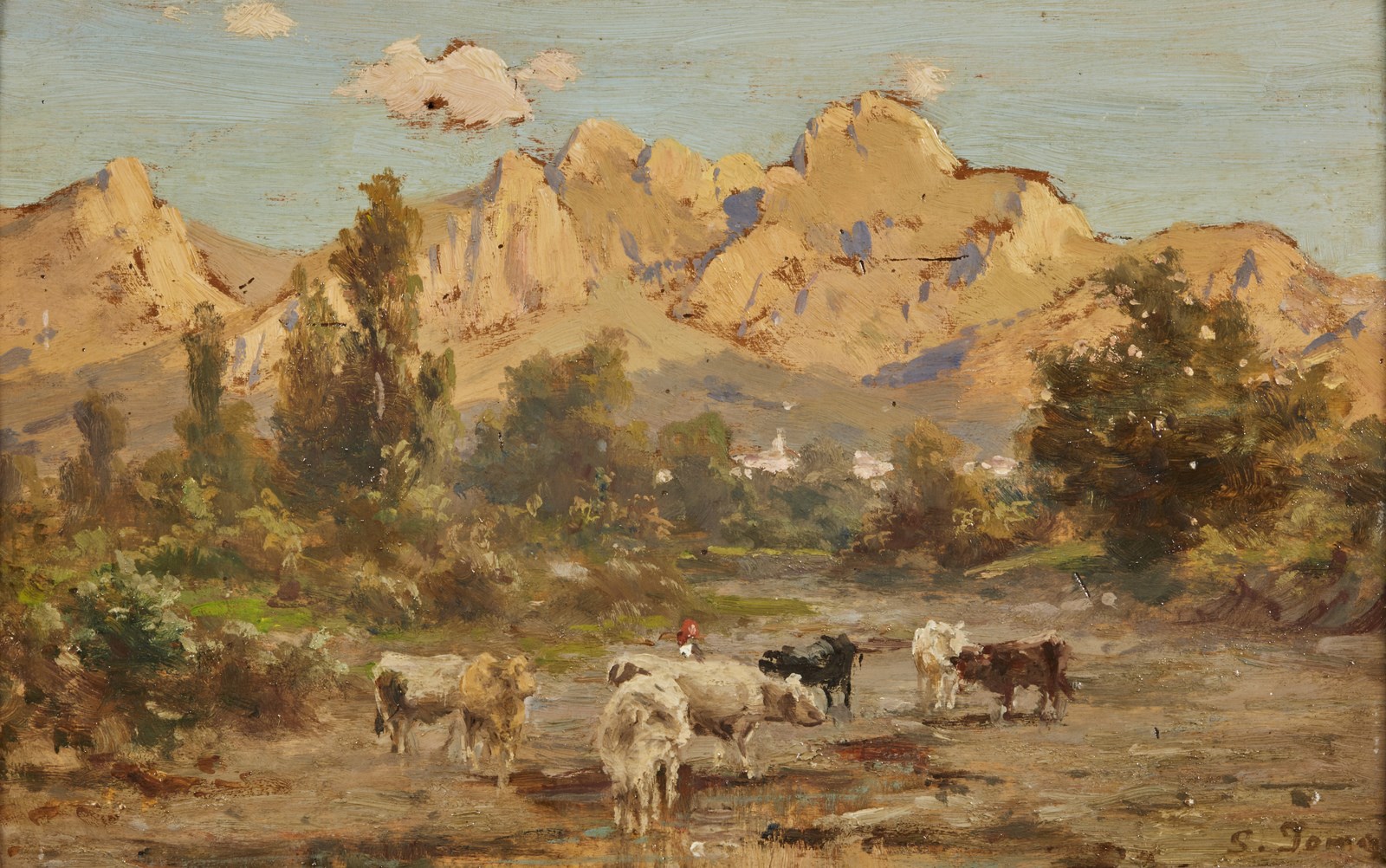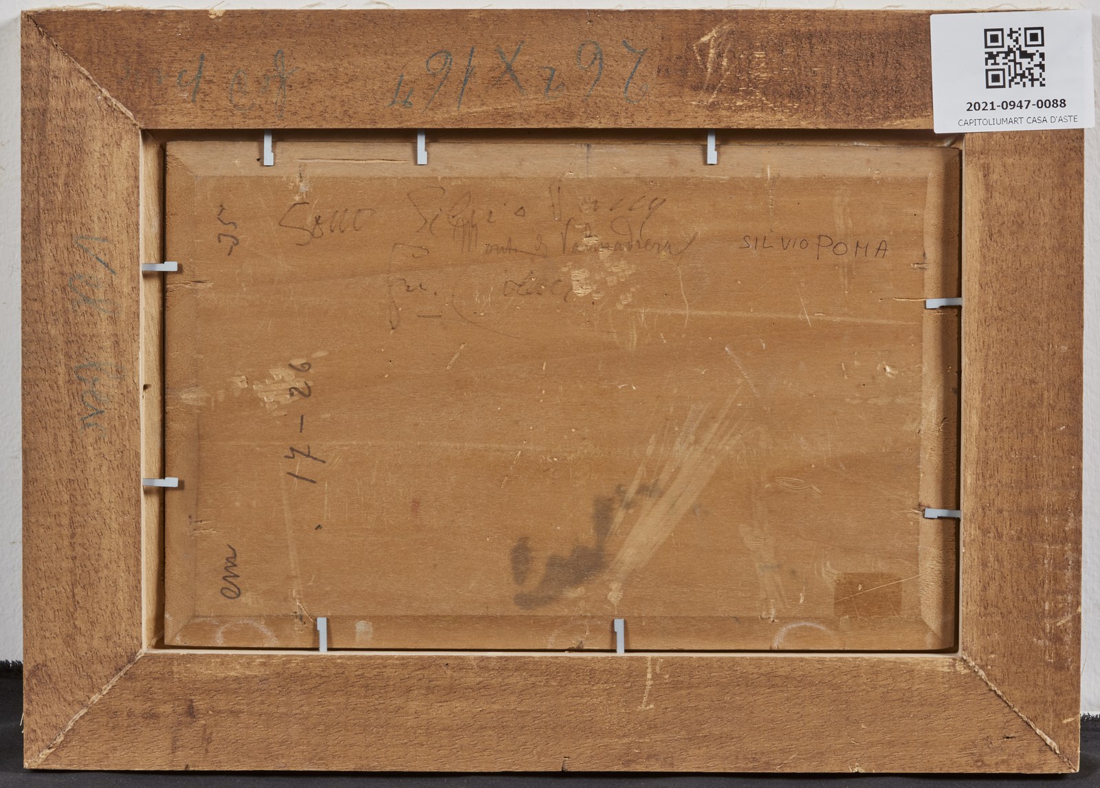 POMA SILVIO (1841 - 1932) Paesaggio montano con pastorella e gregge. . Olio su tavoletta. Cm 26,00 x 17,00. Firmato in basso a destra. . Cornice presente