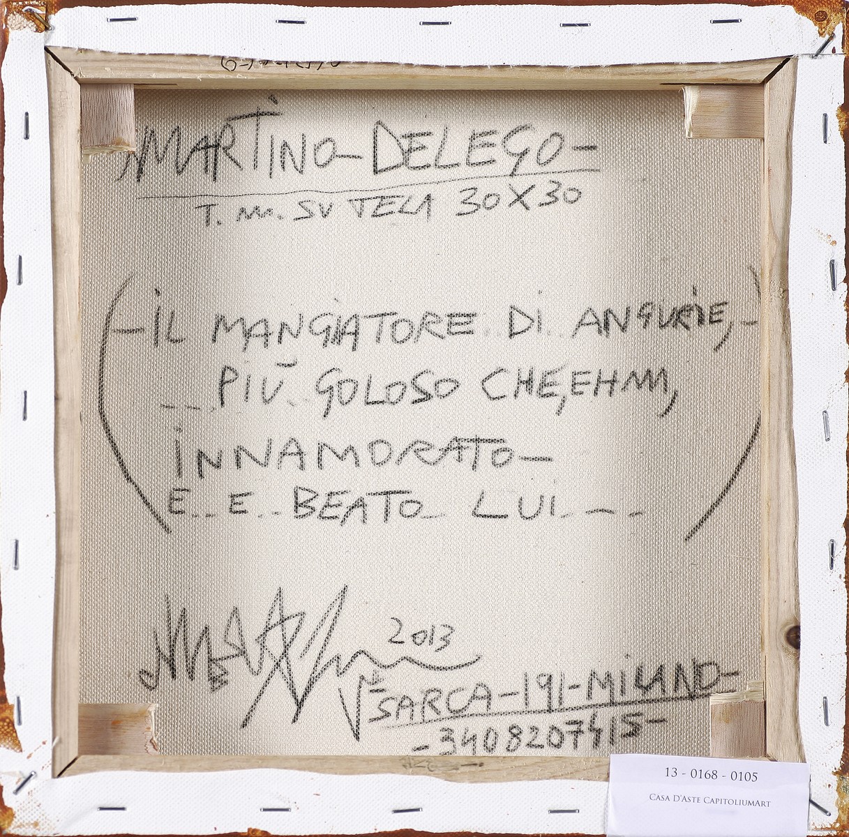 DELEGO MARTINO (n. 1956) Il mangiatore di angurie, più goloso che ehm innamorato, e e beato lui. 2013. Tecnica mista su tela. Cm 30,00 x 30,00 x 3,50. Al retro firma, data e titolo. Autentica dell'artista su fotografia.