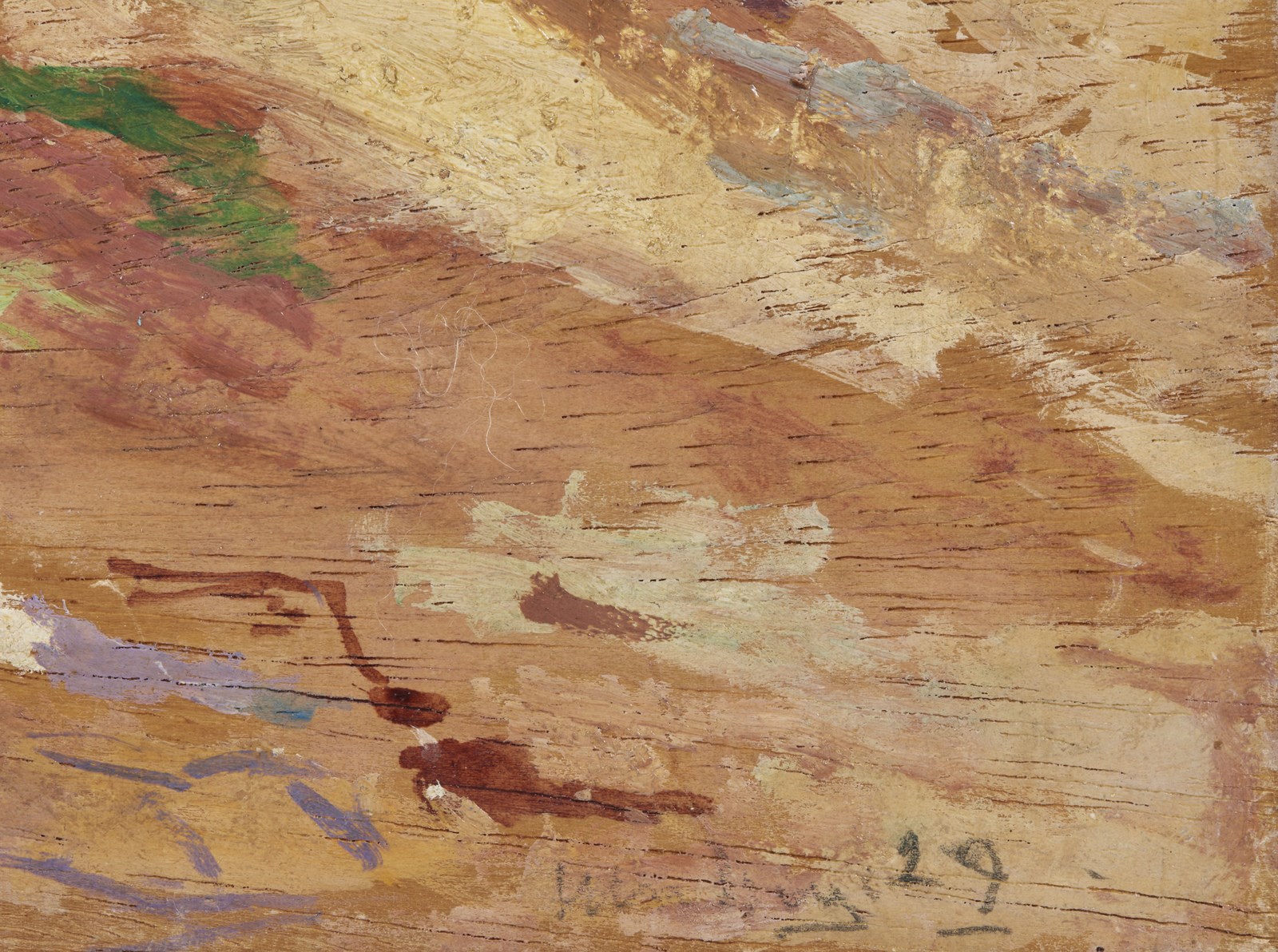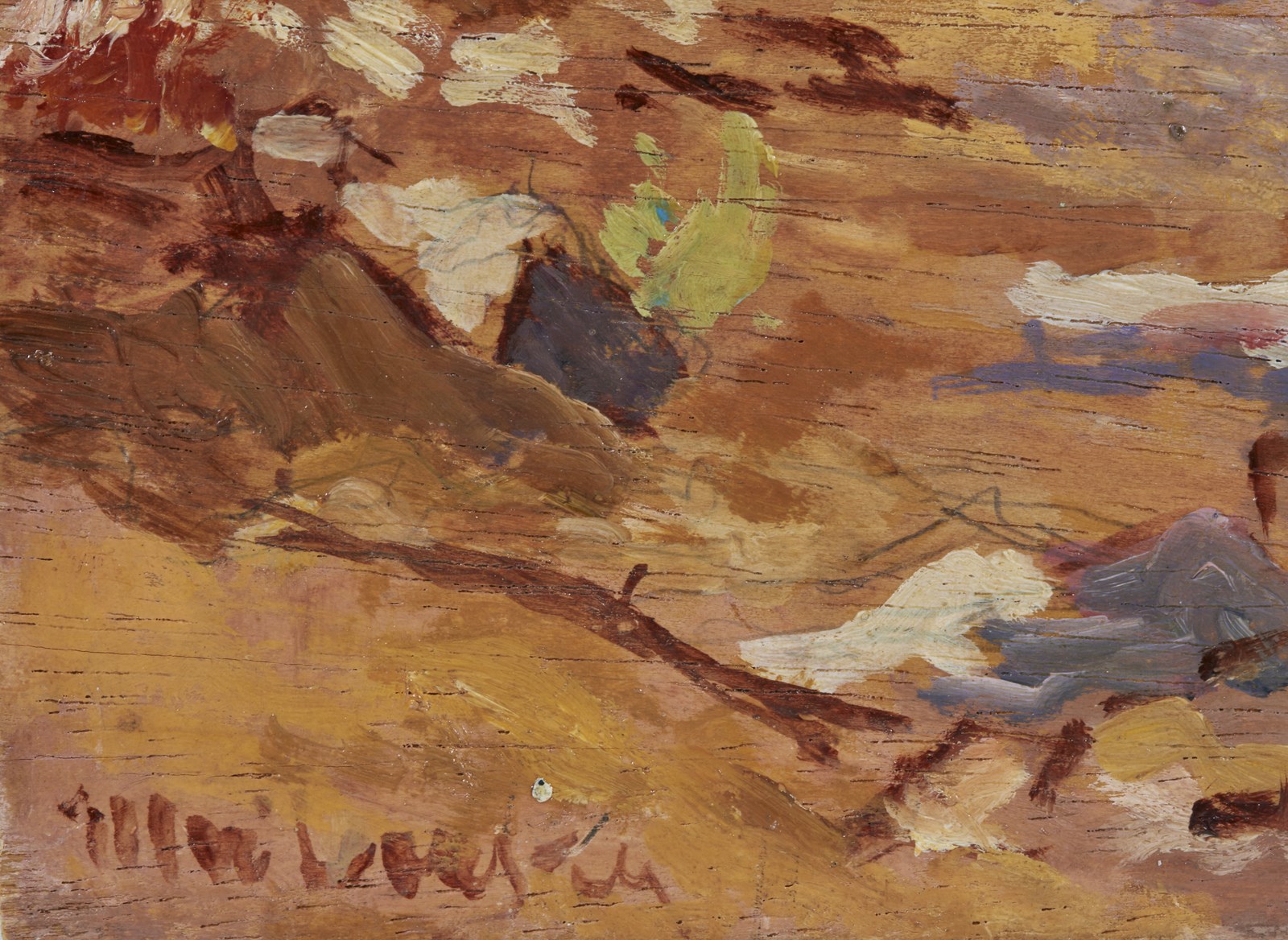 LIEGI ULVI (1859 - 1939) Scogliera di Antignano. Olio su faesite. Cm 56,00 x 29,00. Firmato in basso a sinistra. Datato 1929 in basso a destra. Al retro intitolato e datato. . Cornice presente