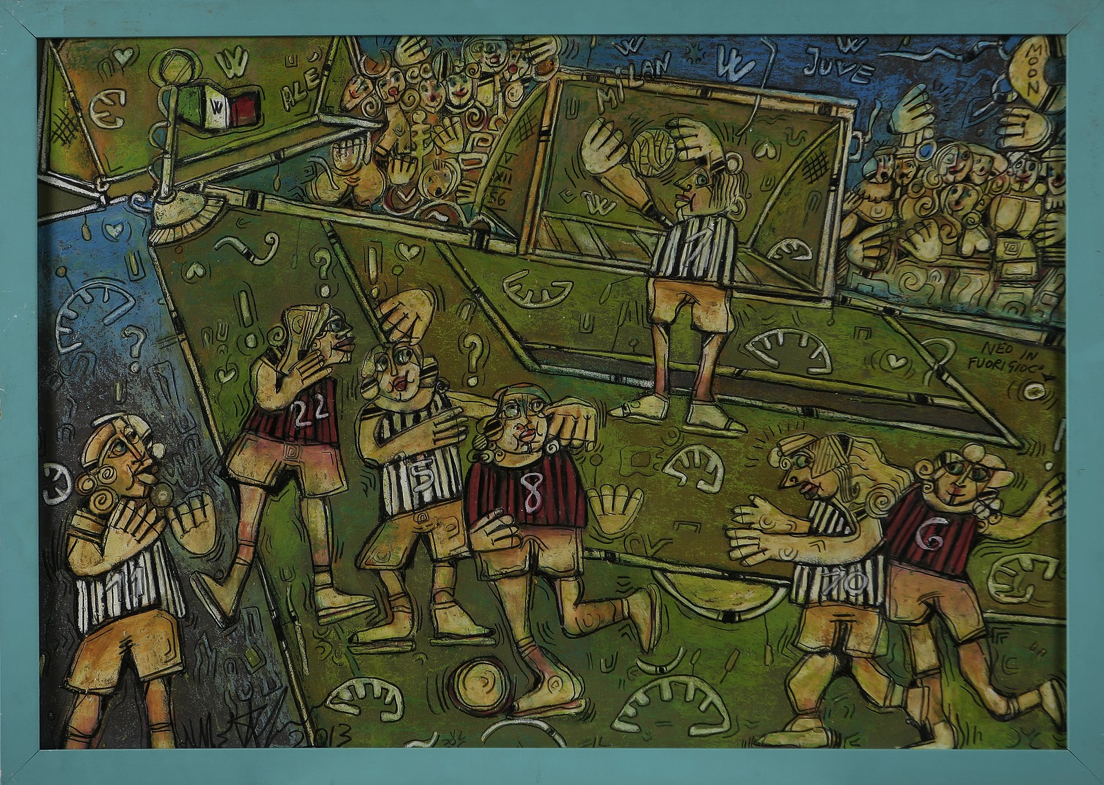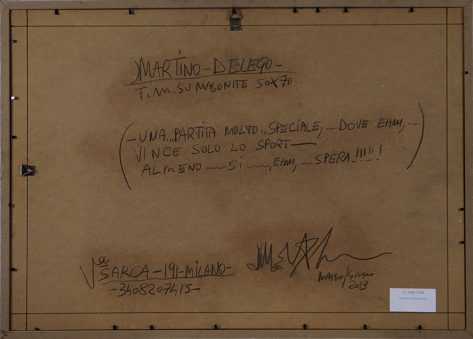 DELEGO MARTINO (n. 1956) Una partita molto speciale, dove ehm, vince solo lo sport, almeno si, ehm, spera. 2013. Tecnica mista su masonite. Cm 70,00 x 50,00. Firma e data in basso a sinistra. Al retro firma, data e titolo. Autentica dell'artista su fotografia. Cornice presente