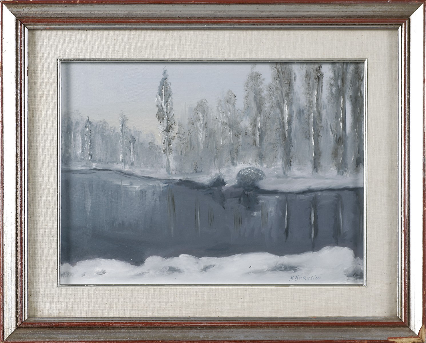 MOROSINI MASSIMO Senza titolo. 1977. Olio su tela . Cm 40,00 x 30,00. Firma in basso a destra. Al retro firma e data. Cornice presente