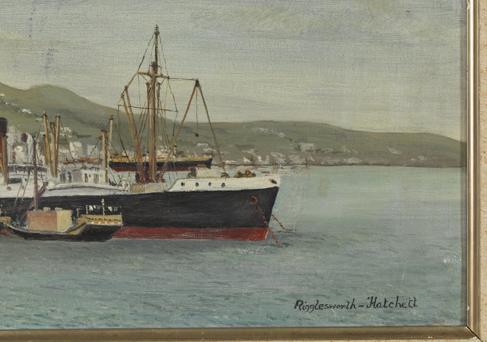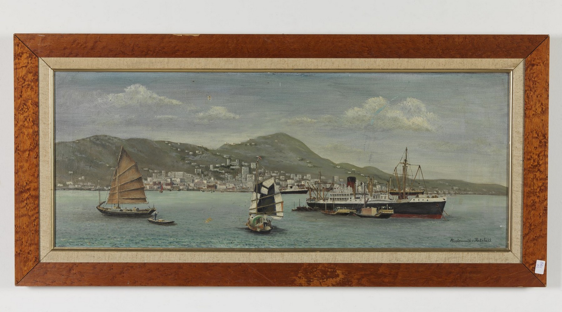 E. RIGGLESWORTH HATCHETT (XX SECOLO) Porto di Hong Kong. . Olio su tela . Cm 91,50 x 36,00. Firmato in basso a destra. Intitolato al retro. Cornice presente