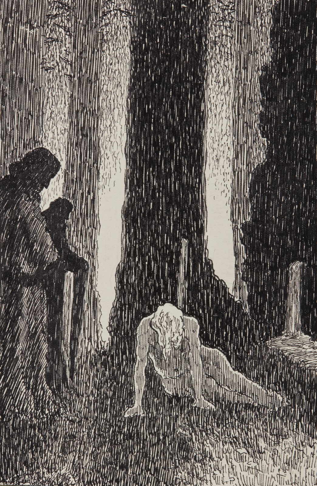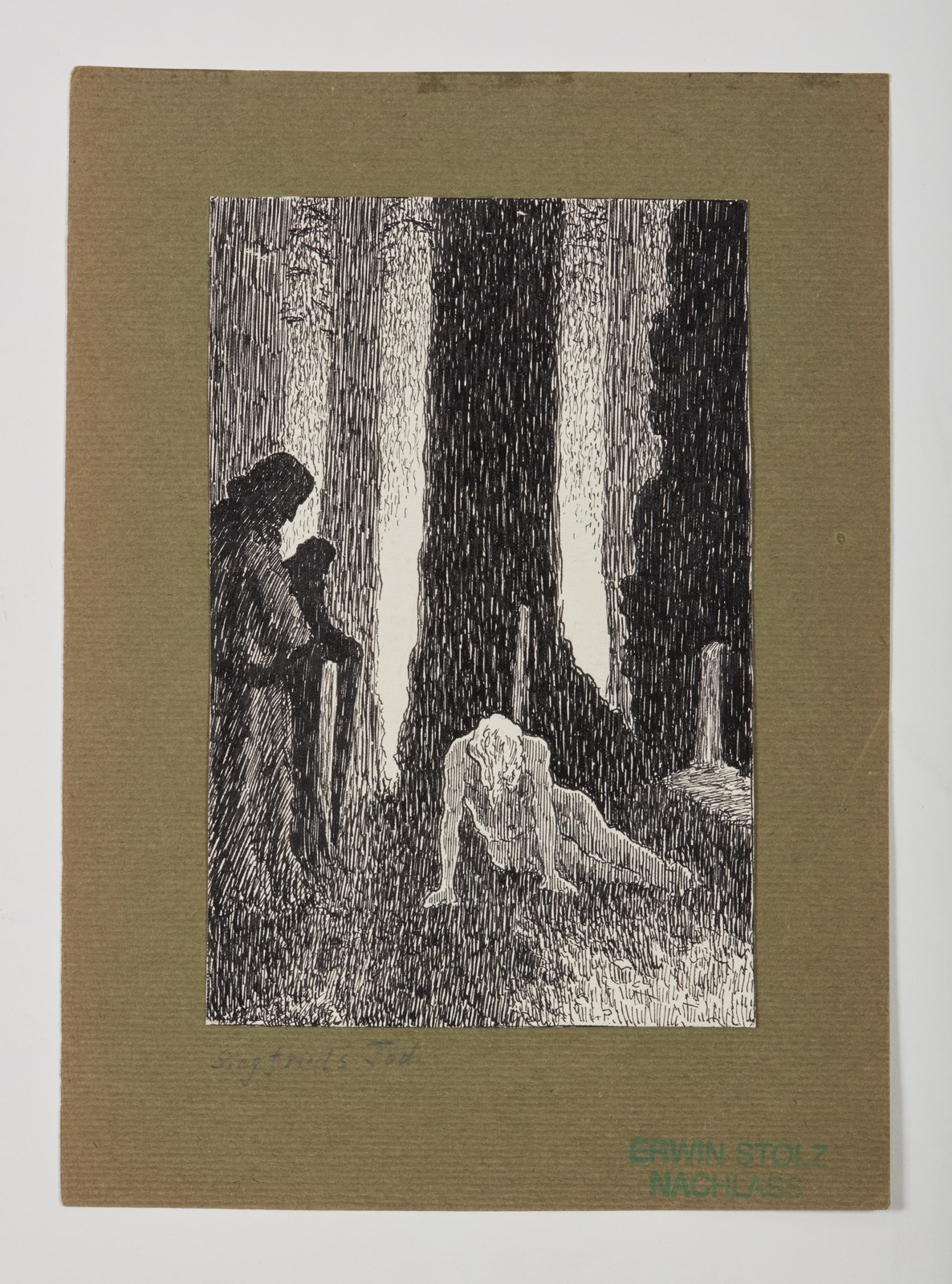 STOLTZ ERWIN (1896 - 1987) La morte di Sigfrido. Penna e inchiostro su carta. Cm 10,50 x 16,30. Timbro dell'artista apposto sul passpartout.