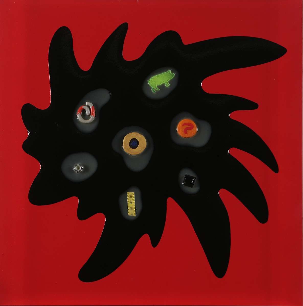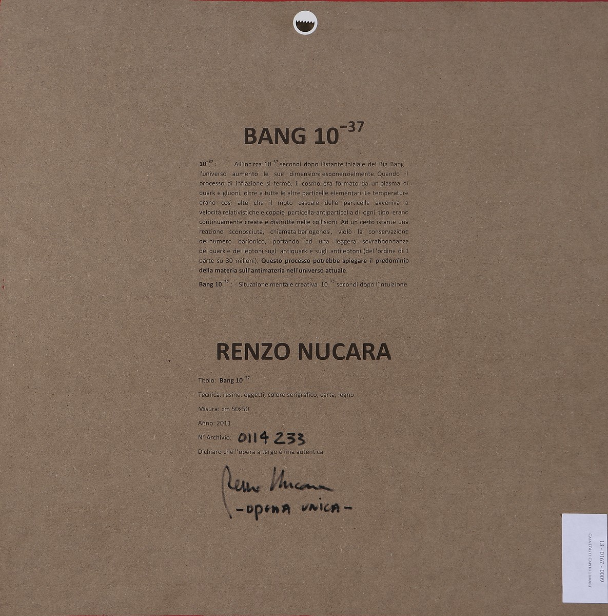 NUCARA RENZO (n. 1955) Bang 10 -37. 2011. Legno, carta, colore serigrafico, resine, oggetti. Cm 50,00 x 50,00. In teca di plexiglass. Opera archiviata presso l'archivio Renzo Nucara come da documentazione fotografica allegata riportante il relativo numero d'archivio; al retro numero d'archivio, firma, opera unica.