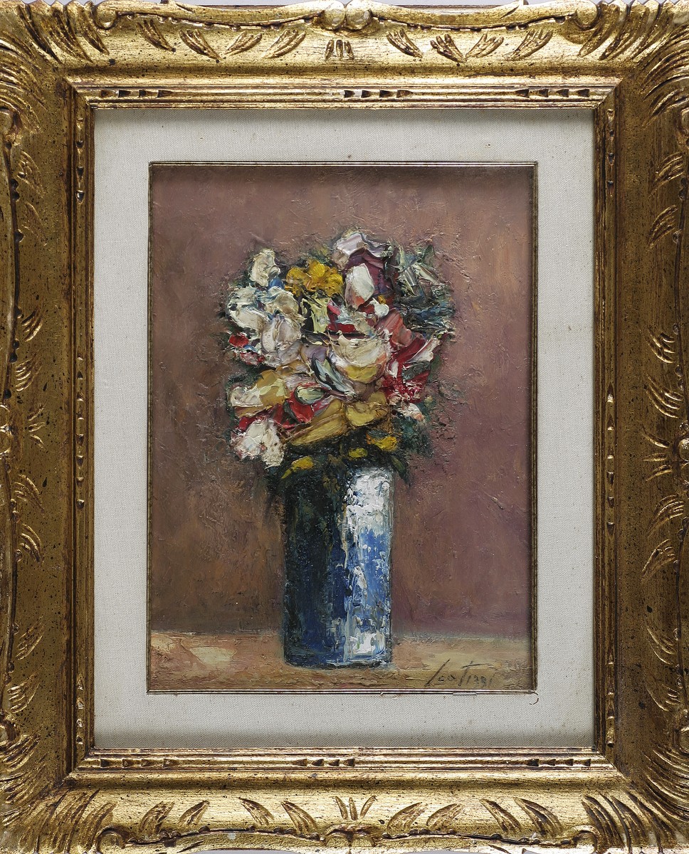 SCATIZZI SERGIO (1918 - 2009) Vasetto di fiori. Olio su tavola. Cm 31,00 x 40,00. Al retro firma e titolo. Autentica dell'artista su fotografia. Cornice presente