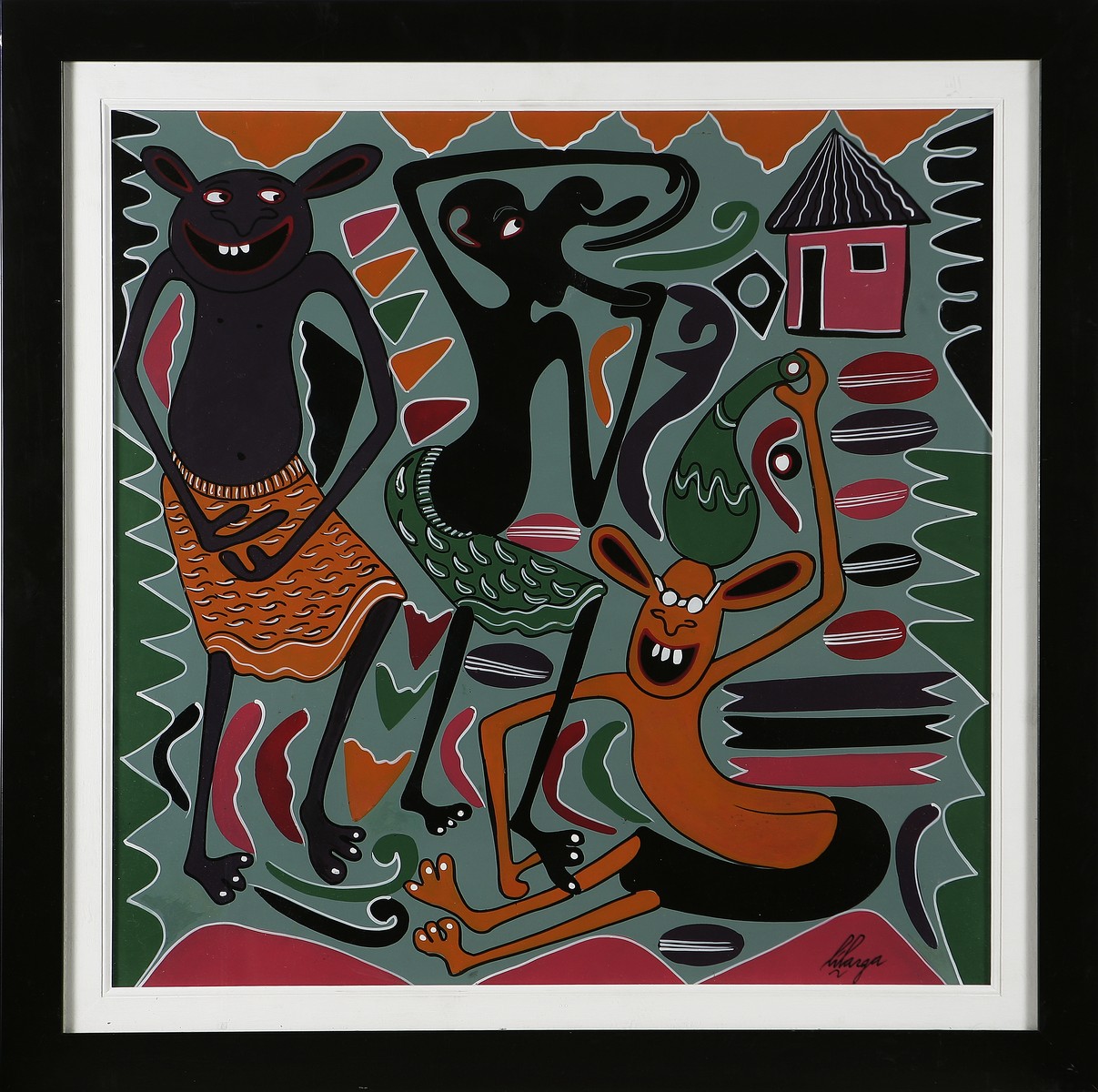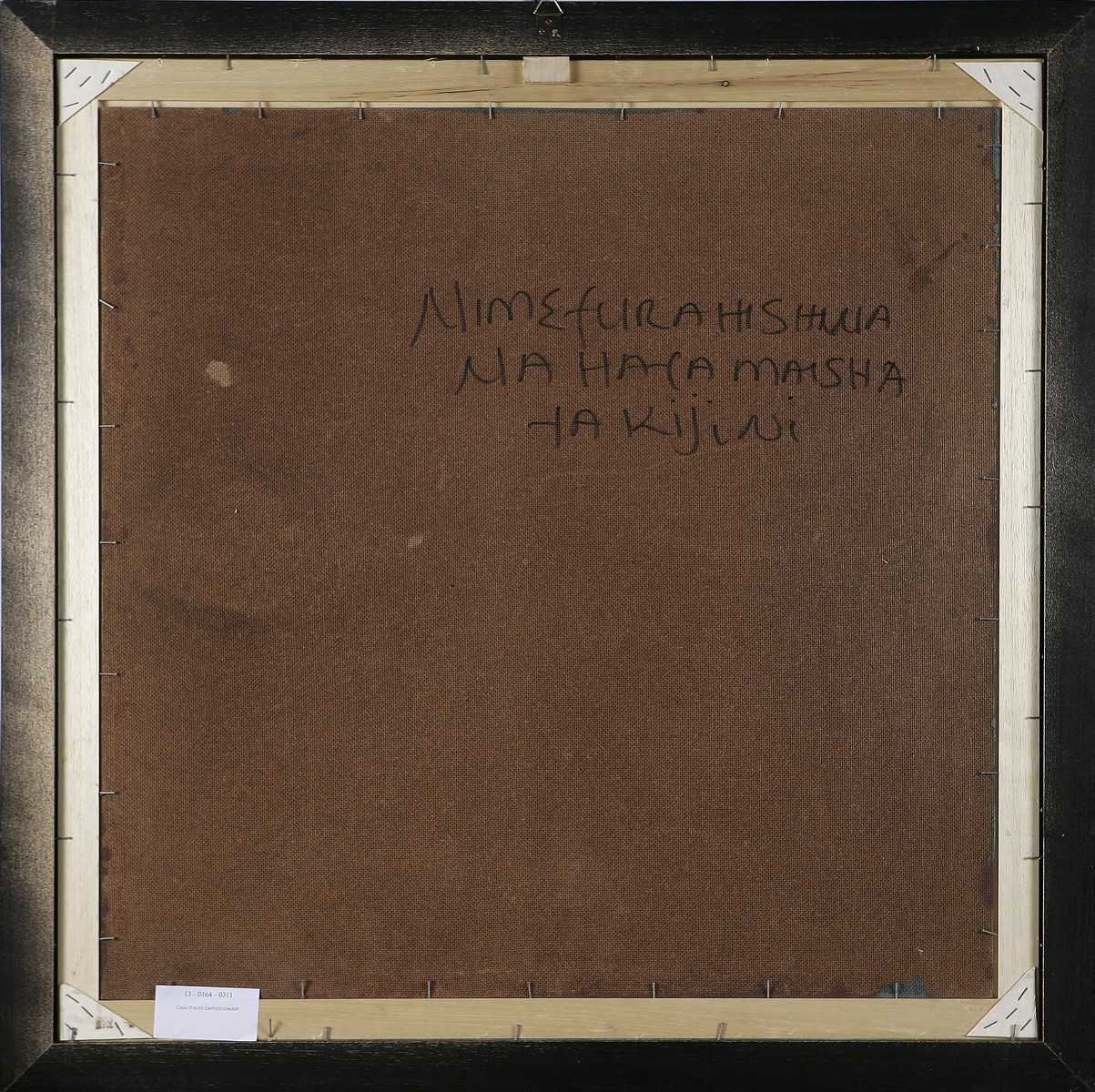 LILANGA GEORGE (1940 - 2005) Nimefurahishwa na haja maisha ja kijini. acrilico su faesite. Cm 61,00 x 61,00. Firma in basso a destra. Al retro titolo. Certificato di autenticità a cura del Capitain Felix Lorenz. Cornice presente