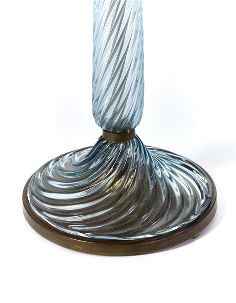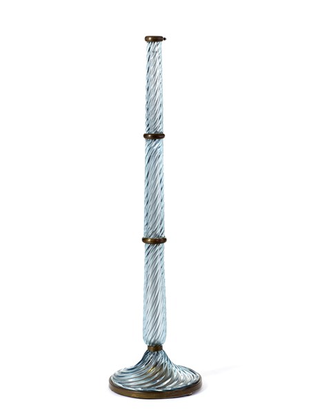 Lampada da terra. Esecuzione Venini, Murano, anni '30. Fusto in vetro soffiato trasparente azzurrino a torciglione diviso in tre settori da anelli in ottone, base bordata in ottone, struttura interna in ferro. Disegno n. 502 del catalogo blu di fornace. (h cm 145) (lievi difetti e restauri)