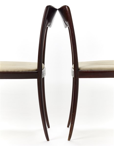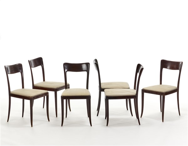 Sei sedie con gambe tornite e affusolate, schienale a cartella. Milano, 1939. Legno di mogano massello, rivestimento del sedile in tessuto beige. (cm 41x80x53) (difetti e restauri)